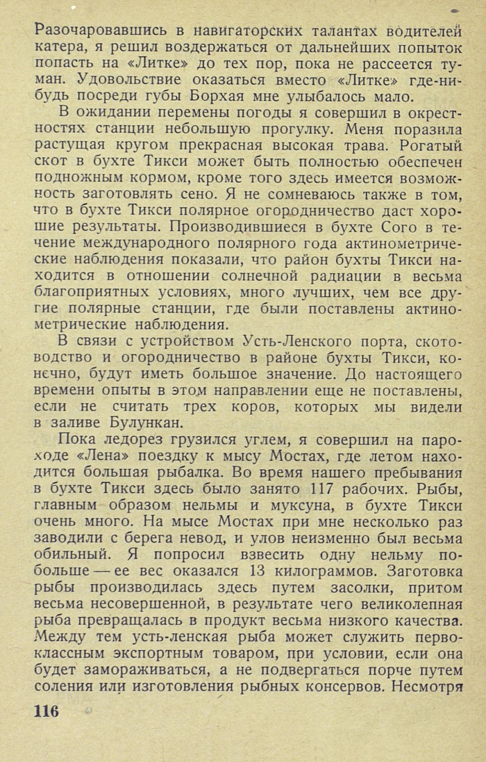 В ожидании перемены погоды я совершил в окрестностях станции небольшую прогулку. Меня поразила растущая кругом прекрасная высокая трава. Рогатый скот в бухте Тикси может быть полностью обеспечен подножным кормом, кроме того здесь имеется возможность заготовлять сено. Я не сомневаюсь также в том, что в бухте Тикси полярное огородничество даст хорошие результаты. Производившиеся в бухте Сого в течение международного полярного года актинометрические наблюдения показали, что район бухты Тикси находится в отношении солнечной радиации в весьма благоприятных условиях, много лучших, чем все другие полярные станции, где были поставлены актинометрические наблюдения.