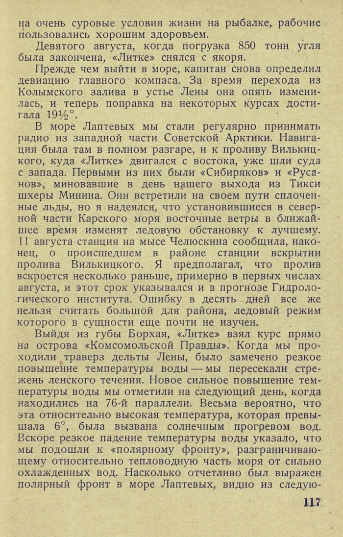 Выйдя из губы Борхая, «Литке» взял курс прямо на острова «Комсомольской Правды». Когда мы проходили траверз дельты Лены, было замечено резкое повышение температуры воды — мы пересекали стрежень ленского течения. Новое сильное повышение температуры воды мы отметили на следующий день, когда находились на 76-й параллели. Весьма вероятно, что эта относительно высокая температура, которая превышала 6°, была вызвана солнечным прогревом вод. Вскоре резкое падение температуры воды указало, что мы подошли к «полярному фронту», разграничивающему относительно тепловодную часть моря от сильно охлажденных вод. Насколько отчетливо был выражен полярный фронт в море Лаптевых, видно из следую-