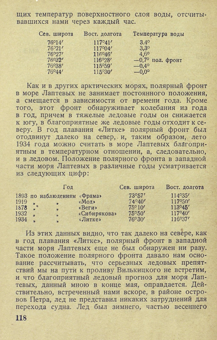 Как и в других арктических морях, полярный фронт в море Лаптевых не занимает постоянного положения, а смещается в зависимости от времени года. Кроме того, этот фронт обнаруживает колебания из года в год, причем в тяжелые ледовые годы он снижается к югу, в благоприятные же ледовые годы отходит к северу. В год плавания «Литке» полярный фронт был отодвинут далеко на север. и, таким образом, лето 1934 года можно считать в море Лаптевых благоприятным в температурном отношении, а, следовательно, и в ледовом. Положение полярного фронта в западной части моря Лаптевых в различные годы усматривается из следующих цифр:
