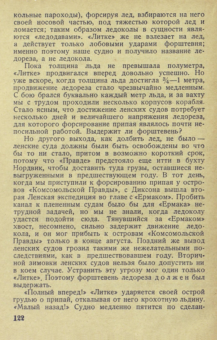 Пока толщина льда не превышала полуметра, «Литке» продвигался вперед довольно успешно. Но уже вскоре, когда толщина льда достигла 3/4—1 метра, продвижение ледореза стало чрезвычайно медленным. С бою брался буквально каждый метр льда, и за вахту мы с трудом проходили несколько корпусов корабля. Стало ясным, что достижение ленских судов потребует несколько дней и величайшего напряжения ледореза, для которого форсирование припая являлось почти непосильной работой. Выдержит ли форштевень?