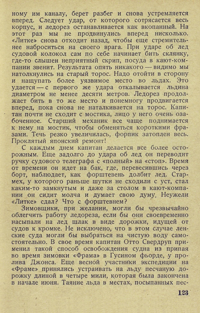 ному им каналу, берет разбег и снова устремляется вперед. Следует удар, от которого сотрясается весь корпус, и ледорез останавливается как вкопанный. На этот раз мы не продвинулись вперед нисколько. «Литке» снова отходит назад, чтобы еще стремительнее наброситься на своего врага. При ударе об лед судовой колокол сам по себе начинает бить склянку, где-то слышен неприятный скрип, посуда в кают-компании звенит. Результата опять никакого — видимо мы натолкнулись на старый торос. Надо отойти в сторону и нащупать более уязвимое место во льдах. Это удается — с первого же удара откалывается льдина диаметром не менее десяти метров. Ледорез продолжает бить в то же место и понемногу продвигается вперед, пока снова не наталкивается на торос. Капитан почти не сходит с мостика, лицо у него очень озабоченное. Старший механик все чаще поднимается к нему на мостик, чтобы обменяться короткими фразами. Течь резко увеличилась, форпик затоплен весь. Проклятый японский ремонт!