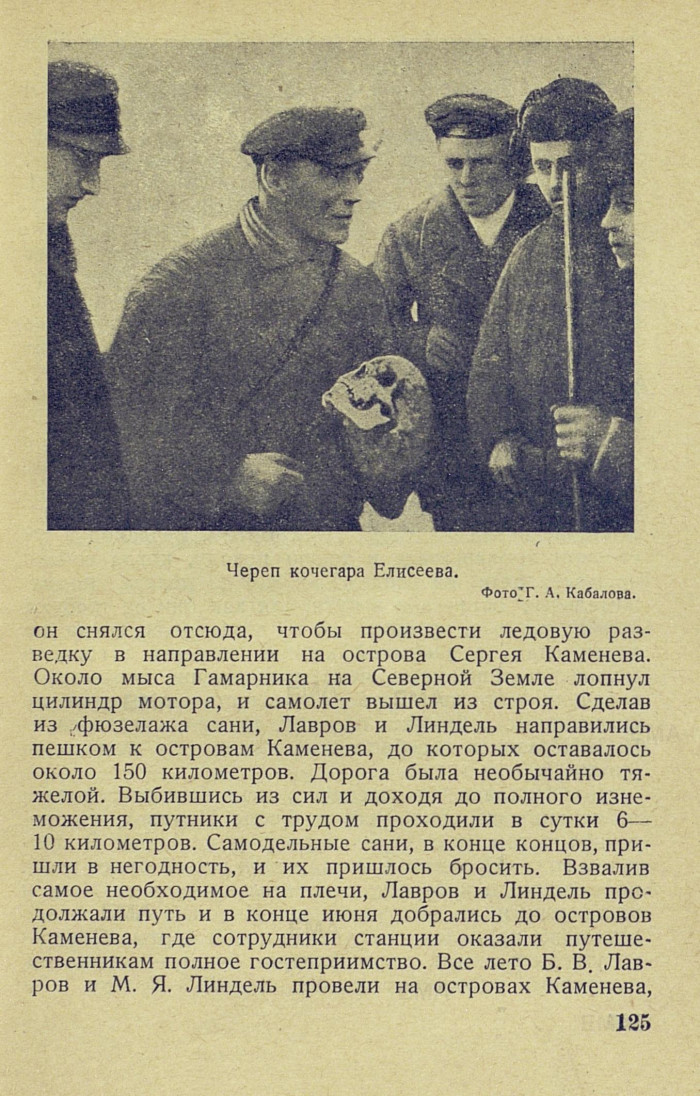 он снялся отсюда, чтобы произвести ледовую разведку в направлении на острова Сергея Каменева. Около мыса Гамарника на Северной Земле лопнул цилиндр мотора, и самолет вышел из строя. Сделав из фюзеляжа сани, Лавров и Линдель направились пешком к островам Каменева, до которых оставалось около 150 километров. Дорога была необычайно тяжелой. Выбившись из сил и доходя до полного изнеможения, путники с трудом проходили в сутки 6-10 километров. Самодельные сани, в конце концов, пришли в негодность, и их пришлось бросить. Взвалив самое необходимое на плечи, Лавров и Линдель продолжали путь и в конце июня добрались до островов Каменева, где сотрудники станции оказали путешественникам полное гостеприимство. Все лето Б. В. Лавров и М. Я. Линдель провели на островах Каменева,