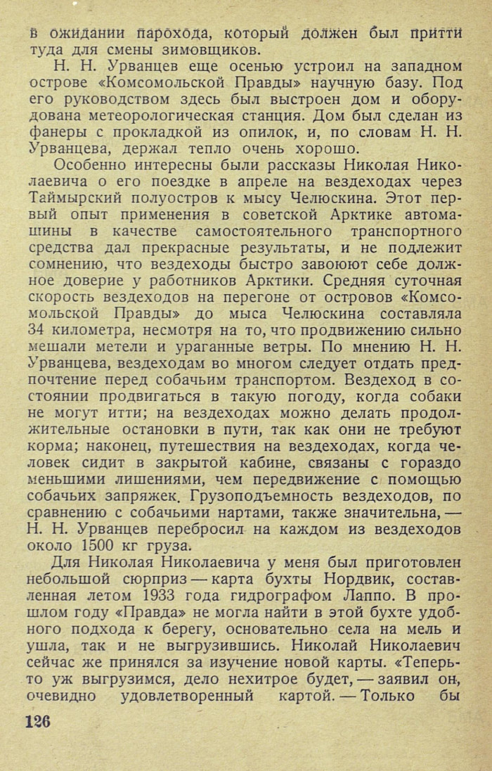 Особенно интересны были рассказы Николая Николаевича о его поездке в апреле на вездеходах через Таймырский полуостров к мысу Челюскина. Этот первый опыт применения в советской Арктике автомашины в качестве самостоятельного транспортного средства дал прекрасные результаты, и не подлежит сомнению, что вездеходы быстро завоюют себе должное доверие у работников Арктики. Средняя суточная скорость вездеходов на перегоне от островов «Комсомольской Правды» до мыса Челюскина составляла 34 километра, несмотря на то, что продвижению сильно мешали метели и ураганные ветры. По мнению H. Н. Урванцева, вездеходам во многом следует отдать предпочтение перед собачьим транспортом. Вездеход в состоянии продвигаться в такую погоду, когда собаки не могут итти; на вездеходах можно делать продолжительные остановки в пути, так как они не требуют корма; наконец, путешествия на вездеходах, когда человек сидит в закрытой кабине, связаны с гораздо меньшими лишениями, чем передвижение с помощью собачьих запряжек. Грузоподъемность вездеходов, по сравнению с собачьими нартами, также значительна, — H. Н. Урванцев перебросил на каждом из вездеходов около 1500 кг груза.