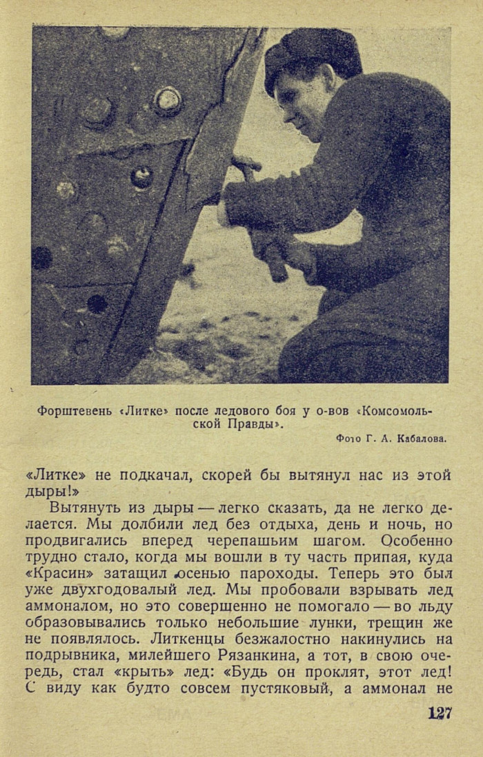 местах были обнаружены громадные расхождения швов. В форштевне оказались три трещины, частично была сорвана наклепка и выбита накладка, некоторые листы отстали от форштевня. Выражаясь техническим языком, форштевень совершенно потерял свою жесткость. По определению старшего механика С. И. Пирожкова, «Литке» стал принимать 1125 тонн воды в сутки, не считая того количества, которое вливалось в форпик, перманентно затопленный. В том состоянии, в каком «Литке» оказался после ледового боя у островов «Комсомольской Правды», дальнейшая работа ледореза во льдах грозила полным разрушением носовой части. Как долго форштевень мог еще выстоять, сказать было трудно. «Может быть протянем 30 миль, а может быть и все 300», — определил капитан. «Но, как ни тяжелы повреждения, попробуем исправить их своими средствами. Как вы думаете, Савва Иванович? » — обратился капитан к стармеху. «Исправим! » — решительно ответил тот. Механики немедленно принялись за изготовление новых болтов. Форпик было решено залить цементом.
