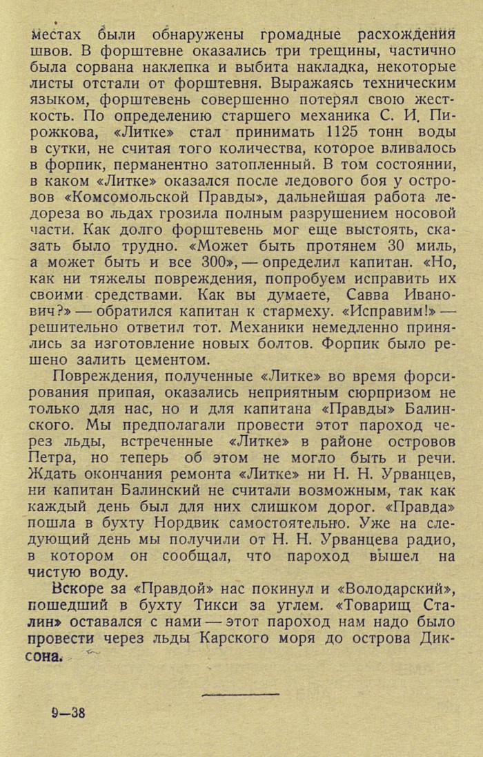 Повреждения, полученные «Литке» во время форсирования припая, оказались неприятным сюрпризом не только для нас, но и для капитана «Правды» Балинского. Мы предполагали провести этот пароход через льды, встреченные «Литке» в районе островов Петра, но теперь об этом не могло быть и речи. Ждать окончания ремонта «Литке» ни H. Н. Урванцев, ни капитан Балинский не считали возможным, так как каждый день был для них слишком дорог. «Правда» пошла в бухту Нордвик самостоятельно. Уже на следующий день мы получили от H. Н. Урванцева радио, в котором он сообщал, что пароход вышел на чистую воду.