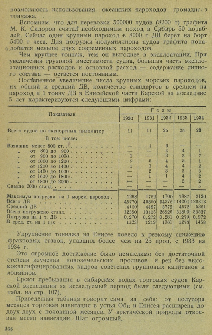 Таким образом, наиболее ранней датой прибытия первого морского корабля в порт за рассматриваемый период было 5 августа (1930 г.), наиболее поздней 9 сентября (1926 г.). -Наиболее позднее окончание погрузо-перегрузочных работ имело место в 1930 г. — 6 октября; в этом же году порты имели максимальное количество посетивших их торговых пароходов — всего 46, из которых 20 в устье Оби и 26 на Енисее, и наибольший срок погрузо-перегрузочных работ, доведенный до 62 суток.