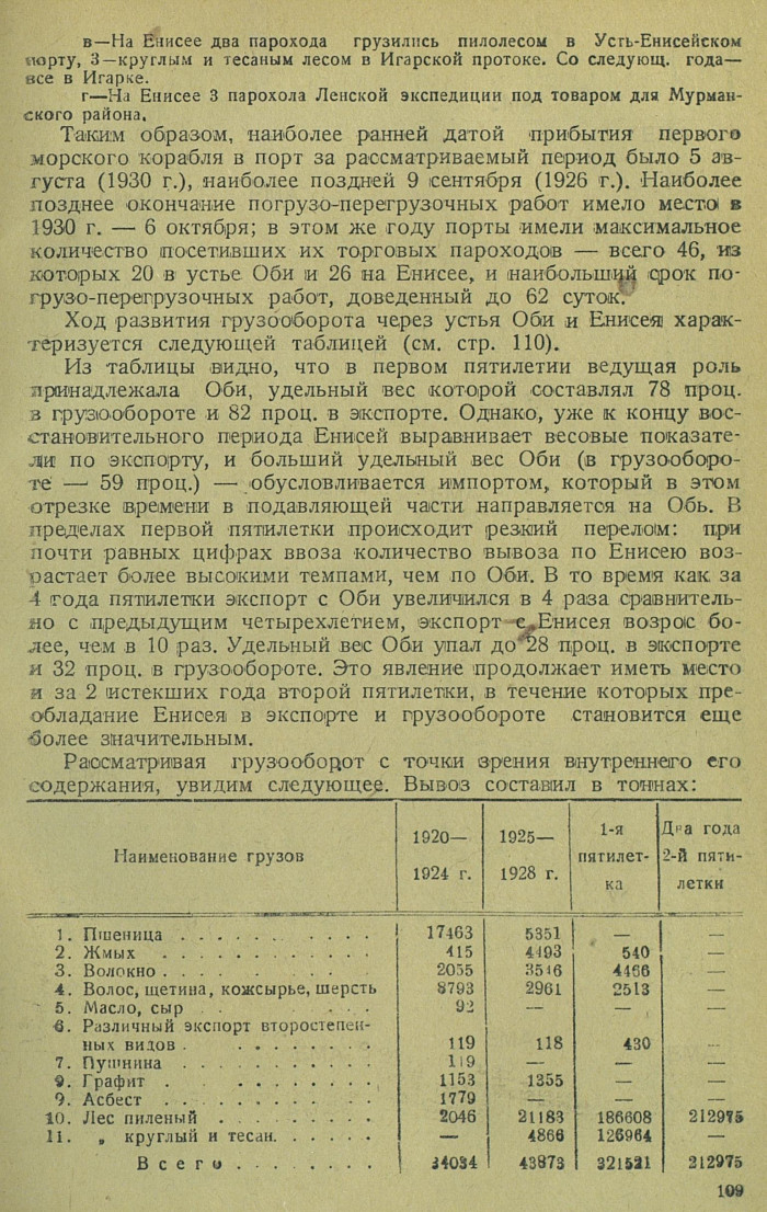 4 года пятилетки экспорт с Оби увеличился в 4 раза сравнительно с предыдущим четырехлетием, экспорт с Енисея возрос более, чем в 10 раз. Удельный вес Оби упал до 28 проц. в экспорте и 32 проц. в грузообороте. Это явление продолжает иметь место и за 2 истекших года второй пятилетки, в течение которых преобладание Енисея в экспорте и грузообороте становится еще более значительным.