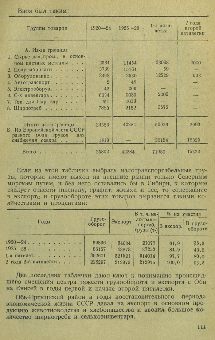 Две последних таблички дают ключ к пониманию происшедшего смещения центра тяжести грузооборота и экспорта с Оби на Енисей в годы первой и начале второй пятилетки.