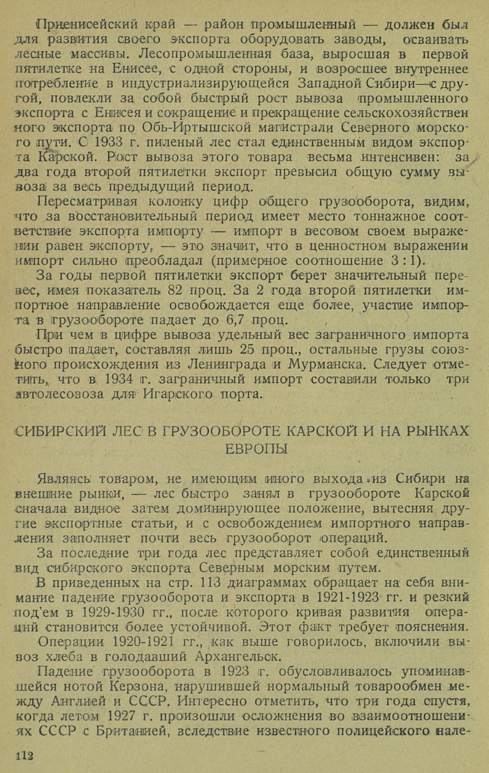 Приенисейский край — район промышленный — должен был для развития своего экспорта оборудовать заводы, осваивать лесные массивы. Лесопромышленная база, выросшая в первой пятилетке на Енисее, с одной стороны, и возросшее внутреннее потребление в индустриализирующейся Западной Сибири— с другой, повлекли за собой быстрый рост вывоза промышленного экспорта с Енисея и сокращение и прекращение сельскохозяйственного экспорта по Обь-Иртышской магистрали Северного морского пути. С 1933 г. пиленый лес стал единственным видом экспорта Карской. Рост вывоза этого товара весьма интенсивен: за два года второй пятилетки экспорт превысил общую сумму вывоза за весь предыдущий период.