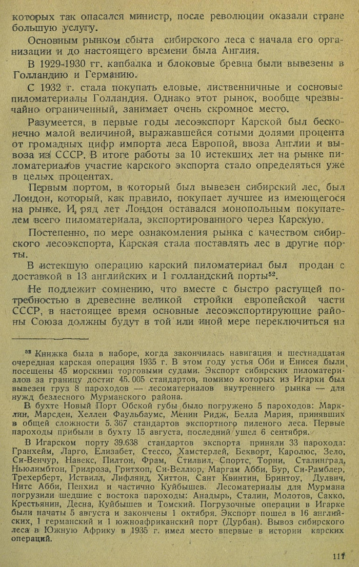 {52} Книжка была в наборе, когда закончилась навигация и шестнадцатая очередная карская операция 1935 г. В этом году устья Оби и Енисея были посещены 45 морскими торговыми судами. Экспорт сибирских пиломатериалов за границу достиг 45.005 стандартов, помимо которых из Игарки был вывезен груз 8 пароходов — лесоматериалов внутреннего рынка — для нужд безлесного Мурманского района.