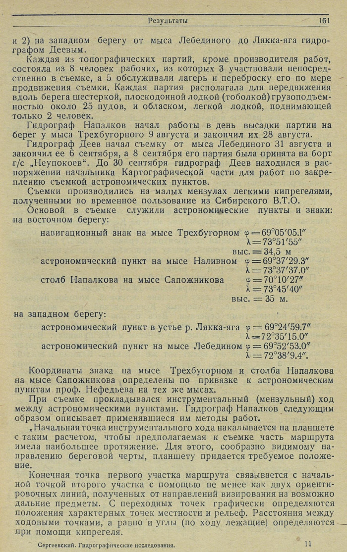 Координаты знака на мысе Трехбугорном и столба Напалкова на мысе Сапожникова определены по привязке к астрономическим пунктам проф. Нефедьева на тех же мысах.