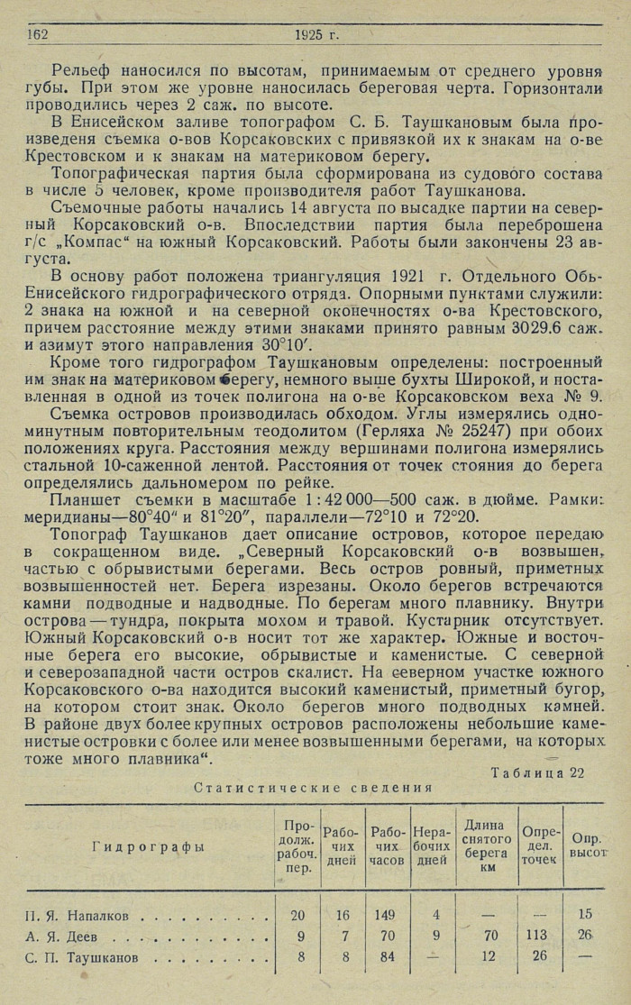 В Енисейском заливе топографом С. Б. Таушкановым была произведена съемка о-вов Корсаковских с привязкой их к знакам на о-ве Крестовском и к знакам на материковом берегу.