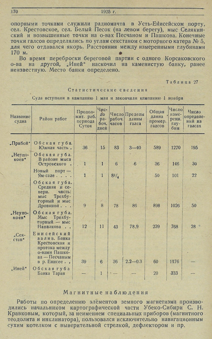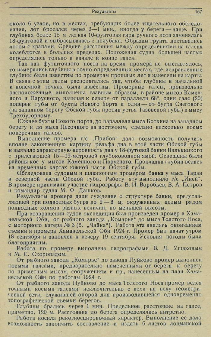 В результате промеров г/с „Неупокоев" в средней части Обской губы обнаружена опасная коса у мыса Наливного, существование которой предполагалось, но положение которой не было известно. Открыта бухта у мыса Сапожникова, приглубая и удобная как убежище от ветров нордовой половины горизонта.