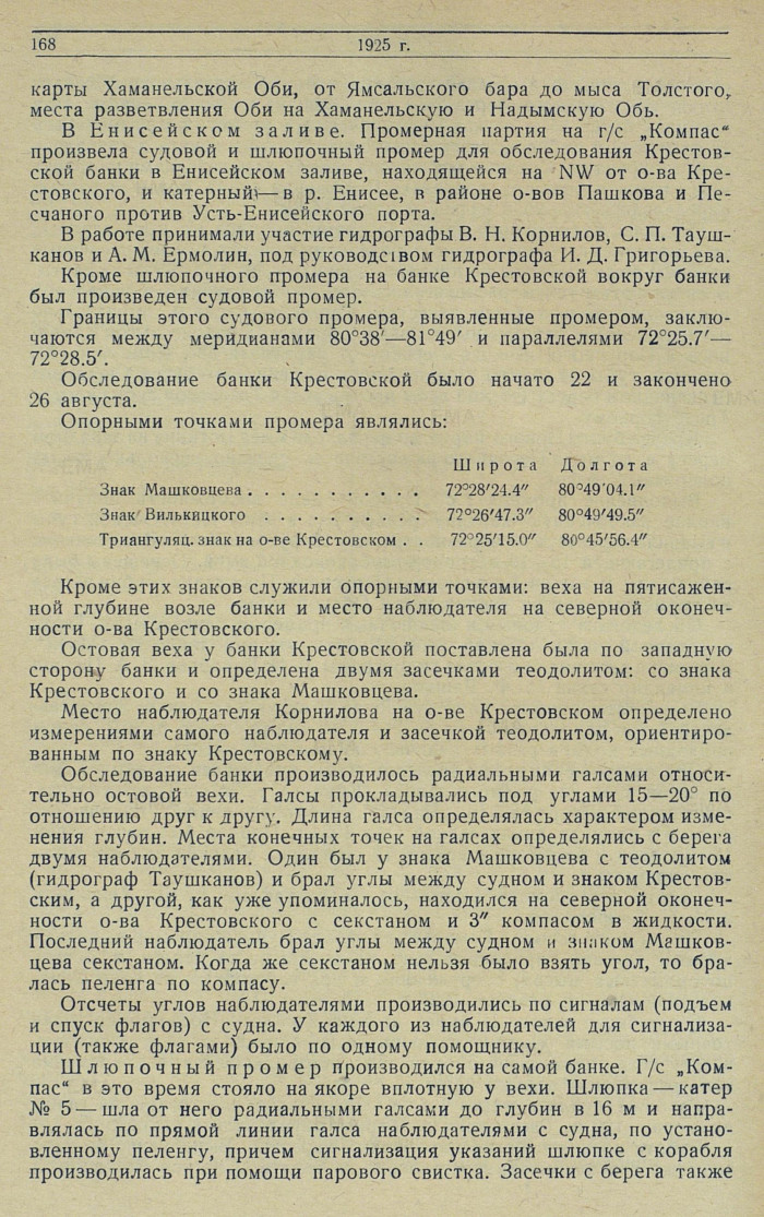 опорными точками служили радиомачта в Усть-Енисейском порту, сел. Крестовское, сел. Белый Песок (на левом берегу), мыс Селякинский и возвышенные точки на о-вах Песчаном и Пашкова. Конечные точки галсов определялись по углам секстаном с моторного катера N° 5, для чего отдавался якорь. Расстояния между измеренными глубинами 170 м.