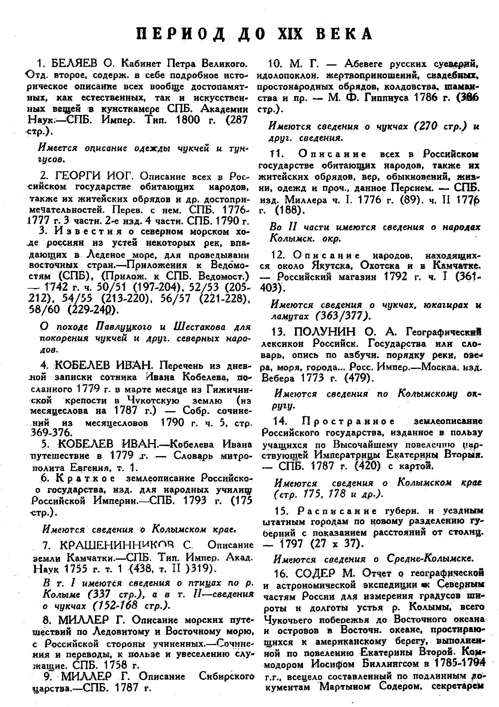 4. КОБЕЛЕВ ИВАН. Перечень из дневной записки сотника (4вана Кобелева, посланного 1779 г. в марте месяце из Гижичниской крепости в Чукотскую землю (из месяцеслова на 1787 г.) — Собр. сочинений из месяцесловов 1790 г. ч. 5, стр. 369-376.