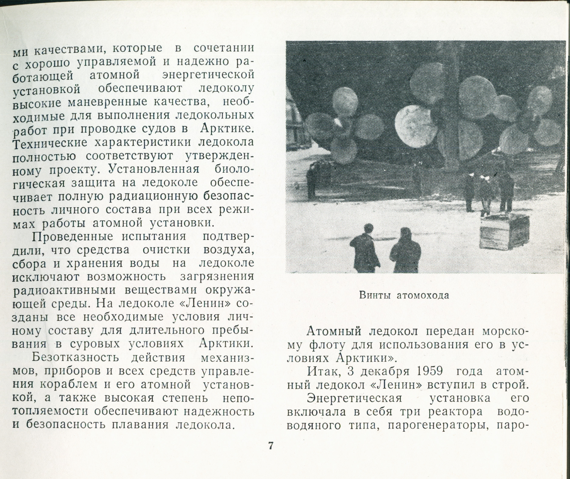 Безотказность действия механизмов, приборов и всех средств управления кораблем и его атомной установкой, а также высокая степень непотопляемости обеспечивают надежность и безопасность плавания ледокола. Атомный ледокол передан морскому флоту для использования его в условиях Арктики».