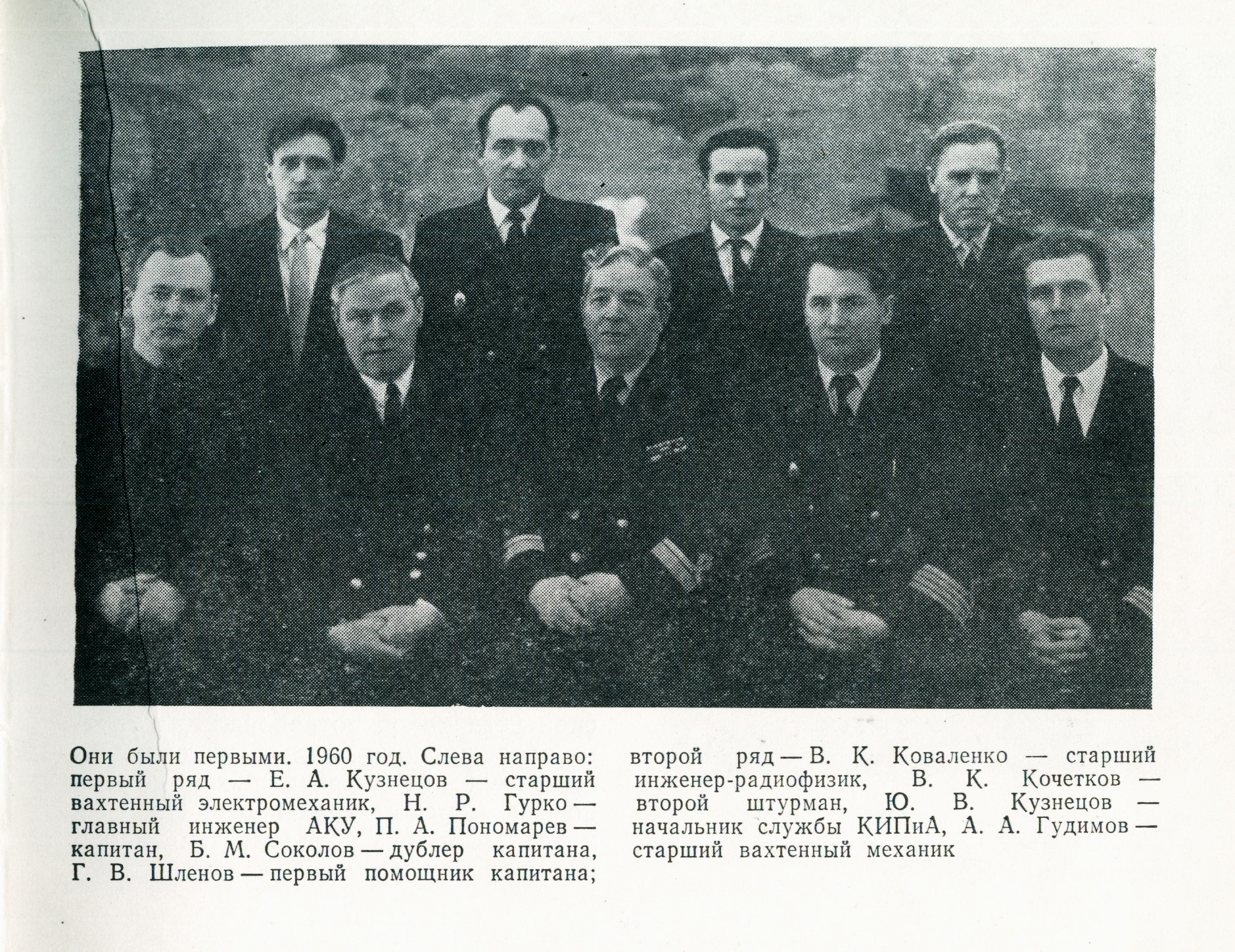 Рядом с молодыми моряками трудились опытные специалисты механики А. В. Неупокоев, Г. В. Гаршин, Г. Я. Орешкин, А. А. Гудимов, К. В. Ильин, М. П. Помазкин, М. М. Лукин, электромеханики С. А. Черняк, И. А. Домахин, В. В. Грозин, Ю. И. Шестопалов, главный инженер АППУ Н. Р. Гурко. Много сил вложили люди в освоение новой техники.