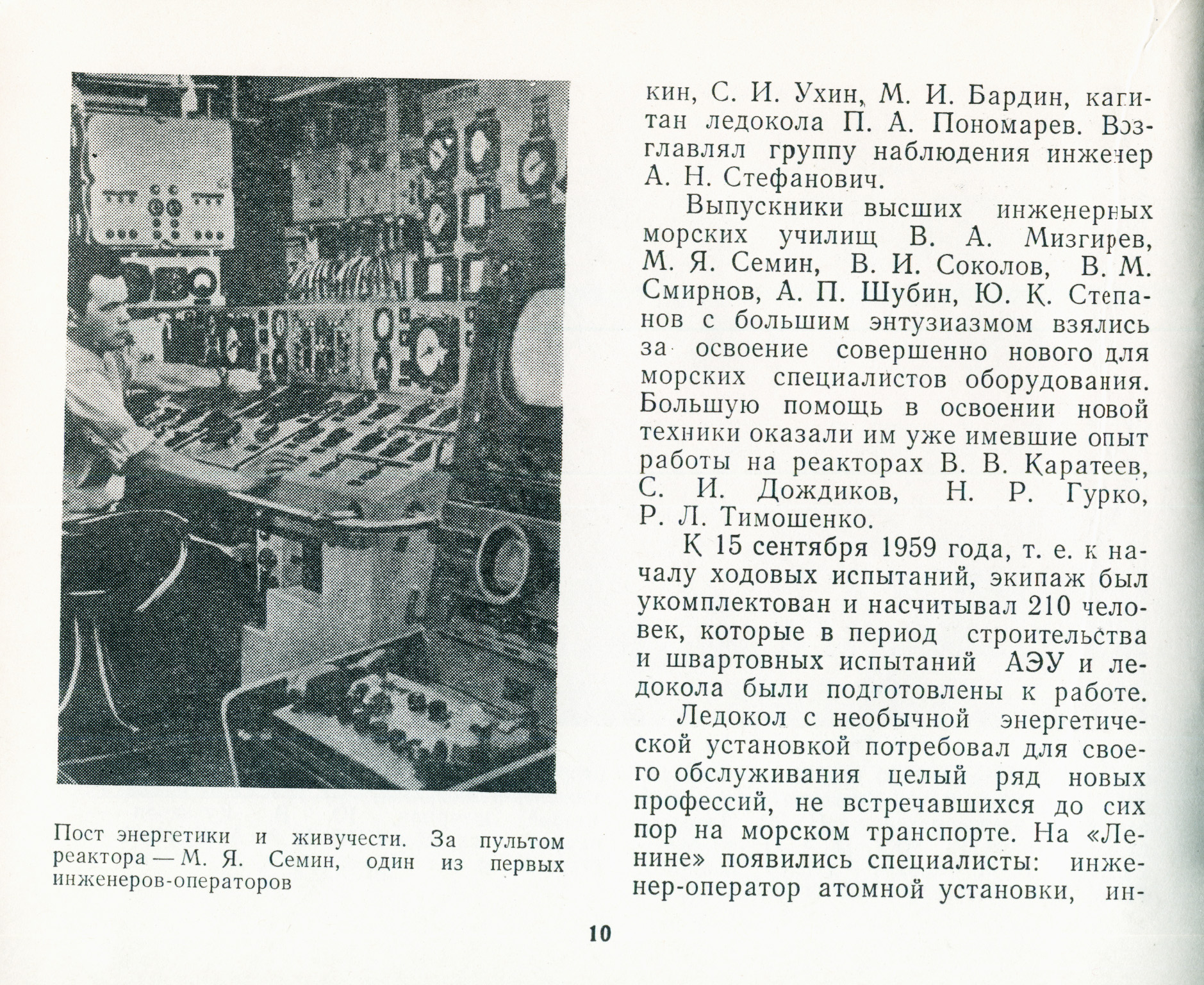 К 15 сентября 1959 года, т.е. к началу ходовых испытаний, экипаж был укомплектован и насчитывал 210 человек, которые в период строительства и швартовных испытаний АЭУ и ледокола были подготовлены к работе.