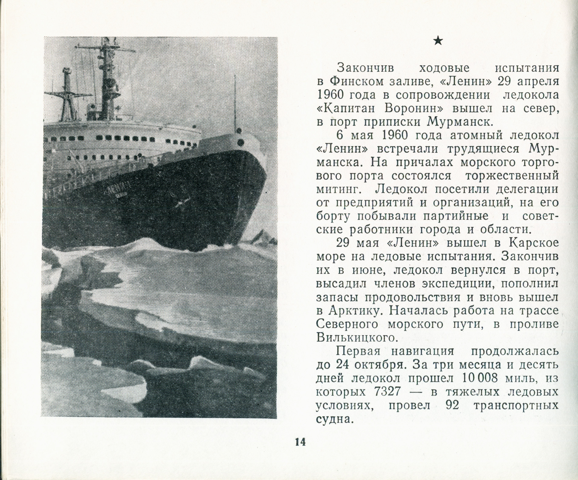 Первая навигация продолжалась до 24 октября. За три месяца и десять дней ледокол прошел 10 008 миль, из которых 7327 - в тяжелых ледовых условиях, провел 92 транспортных судна. Период испытаний ледокола, переход его вокруг Скандинавии с Балтики в Мурманск, а также его первая арктическая навигация 1960 года были для экипажа периодом становления. Экипаж сплачивался, набирался опыта и в скором времени способен был решать сложные задачи безаварийной эксплуатации уникальной техники, выполнять проводку транспортных судов по трассе Северного морского пути в сложных ледовых условиях.