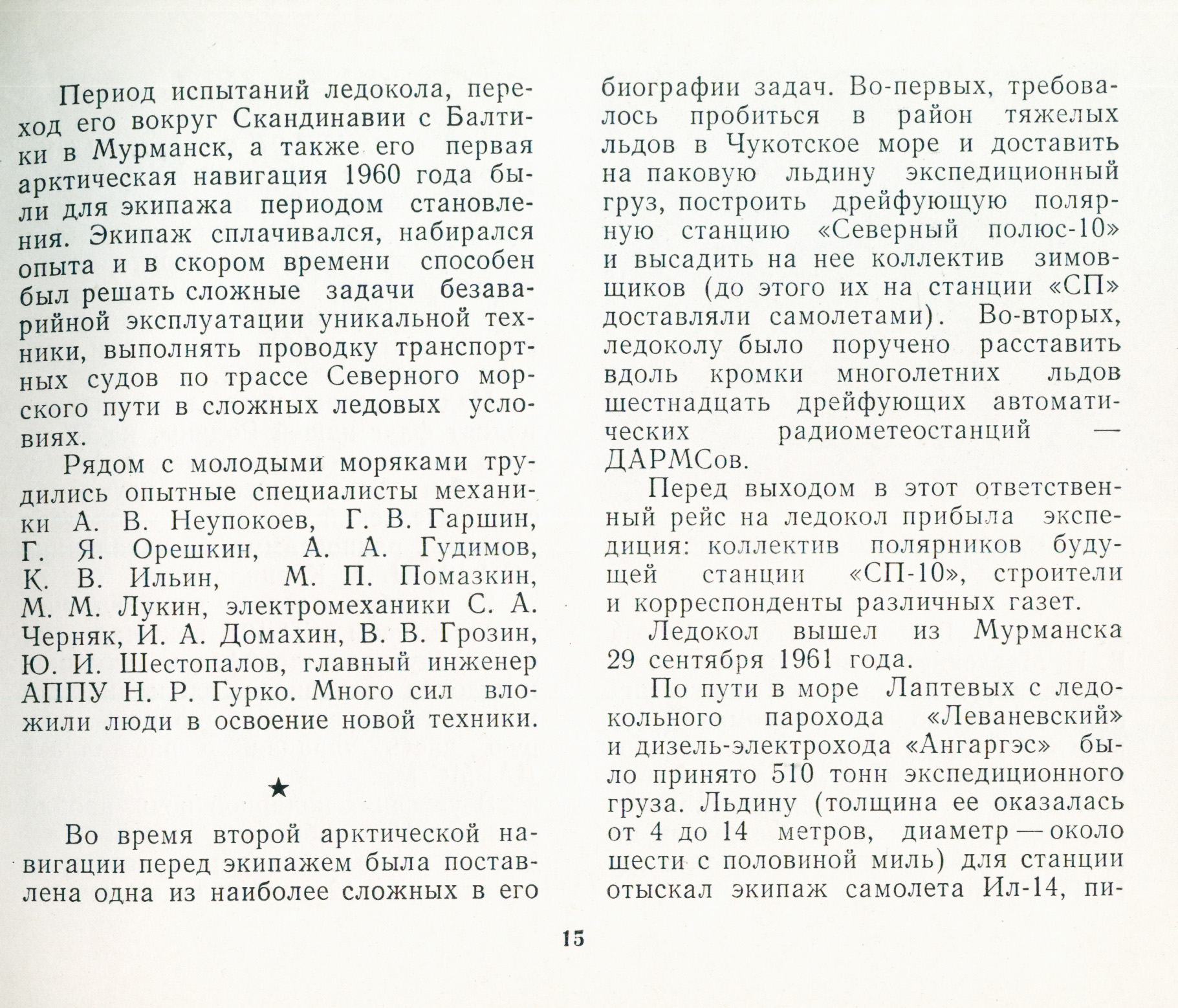 Перед выходом в этот ответственный рейс на ледокол прибыла экспедиция: коллектив полярников будущей станции «СП-10», строители и корреспонденты различных газет.