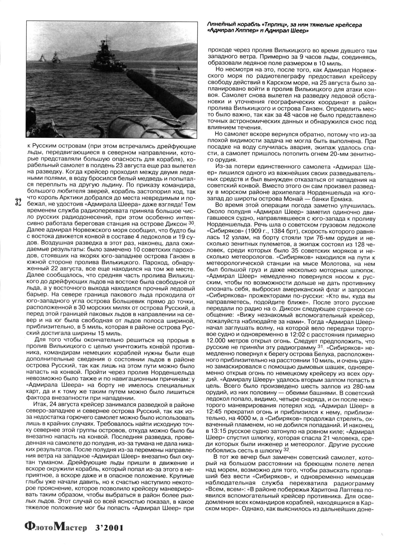 к Русским островам (при этом встречались дрейфующие льды, передвигающиеся в северном направлении, которые представляли большую опасность для корабля), корабельный самолет в полдень 23 августа еще раз вылетел на разведку. Когда крейсер проходил между двумя ледяными полями, в воду бросился белый медведь и попытался переплыть на другую льдину. По приказу командира, большого любителя зверей, корабль застопорил ход, так что король Арктики добрался до места невредимым и побежал, не удостоив «Адмирала Шеера» даже взгляда! Тем временем служба радиоперехвата приняла большое число русских радиодонесений, при этом особенно интенсивно работала береговая станция на острове Диксон