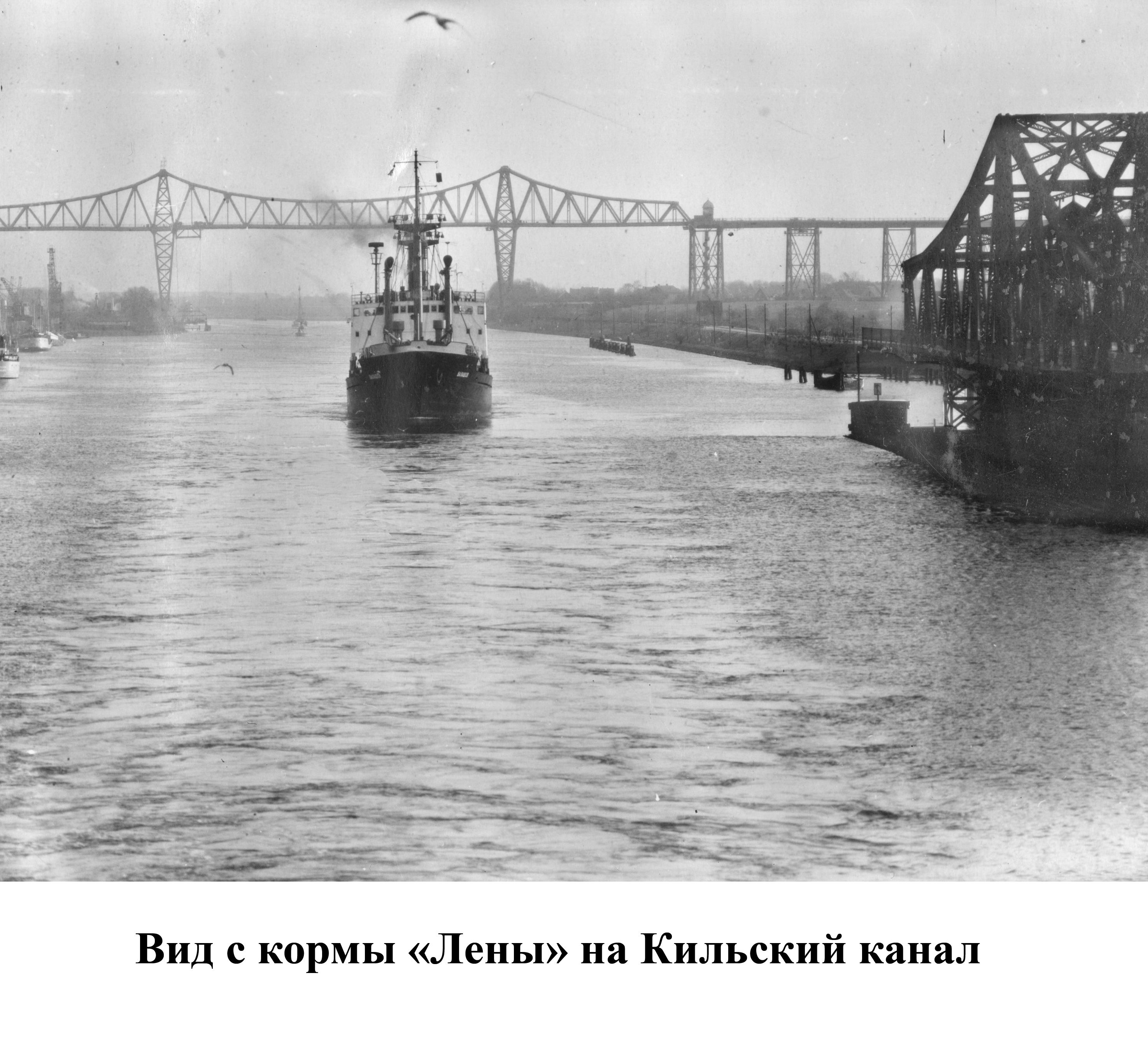 13 декабря 1956 года.Сегодня подъем в 9.00 по московскому времени, часы переведены по местному на два часа назад. Ещё до рассвета вошли в Кильский канал. Он по берегам освещен: видны чистые зелёные берега. Несмотря на то, что по каналу проходят большие корабли с высокими мачтами, имеются величественные мосты: железнодорожные и автомобильные. С одного из таких мостов на палубу «Лены» бросили антисоветские листовки о содержании Венгерских событий.