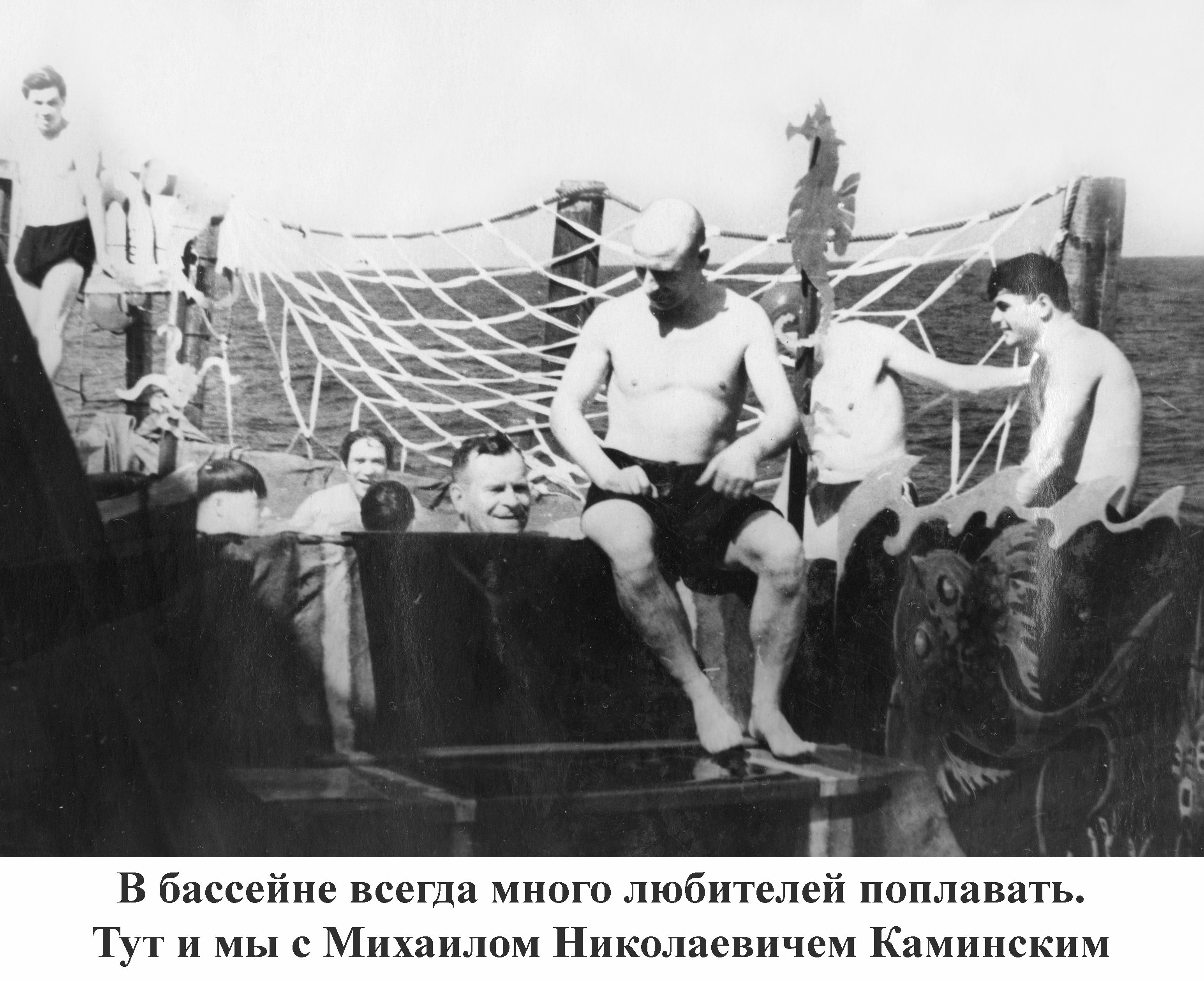 26 декабря 1956 года.Авральный день. Мне пришлось участвовать в изготовлении купального бассейна. Сколотили из толстых досок большой прочный ящик площадью 20 кв. метров. В него опустили громадный брезент, концы которого повесили за борта ящика. В этот брезент помпой из океана будет накачиваться вода, а лишняя через края будет выплескиваться, и всегда вода будет проточной. В этом бассейне нам предстоит купаться, и тут будет происходить крещение тех, кто впервые пересекает экватор. Завтра в этом бассейне будет пробное купание.