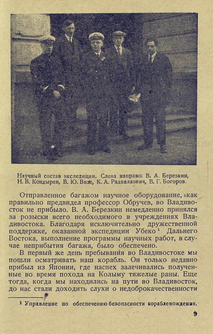...Наконец мы и во Владивостоке. Здесь нас встречает заместитель начальника экспедиции Б. А. Бронштейн, на которого была возложена подготовка экспедиции во Владивостоке. Бронштейн снаряжает, впрочем, не одного только «Литке», но и все многочисленные зимовочные партии, отправляющиеся в восточную Арктику из Владивостока. Вид у него усталый, и весь он какой-то суматошный. По плану, «Литке» должен был выйти в море 20 июня, т. е. через четыре дня после нашего прибытия во Владивосток. Но уже с первых слов становится ясным, что об этом не может быть и речи. Из многочисленных экспедиционных грузов, отправленных из Москвы, до Владивостока докатились только немногие. Большая часть находится еще на колесах, где-то западнее Иркутска. Если мы будем ожидать прибытия этих грузов, то безусловно выйдем в море слишком поздно, и поход «Литке» будет сорван. Для нашей экспедиции, которой предстоит пройти Ледовитым морем 3500 миль, сроки — все. Старинное выражение «упущение времени смерти подобно» как нельзя более подходит к нашей экспедиции, да и вообще ко всем операциям, выполняемым в Арктике в течение короткого полярного лета. У нас нет другого выхода, как произвести снабжение экспедиции частично за счет местных ресурсов. Для того, чтобы выяснить возможность, мы немедленно начинаем объезжать владивостокские государственные учреждения и общественные организации. Отношение к нам всюду исключительно предупредительное, и общественность Владивостока идет нам навстречу, чем только может. Чувствуется, что успех нашей экспедиции здесь всем не менее дорог, чем нам самим. На сердце делается легче, и снова крепнет уверенность, что мы сумеем выйти в море своевременно.