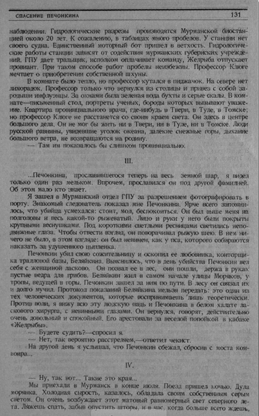 Я зашел в Мурманский отдел ГПУ за разрешением фотографировать в порту. Знакомый следователь показал мне Печонкина. Ярче всего запомнилось, что убийца усмехался: стоит, мол, беспокоиться. Он был выше меня на полголовы и весь какой-то рыжеватый. Лицо и руки у него были покрыты крупными веснушками. Под короткими светлыми ресницами светились неподвижные глаза. Чтобы отвести взгляд, он поворачивал рыжую шею. В нем ничего не было, в этом взгляде: он был невинен, как у пса, которого собираются наказать за удушенного цыпленка.