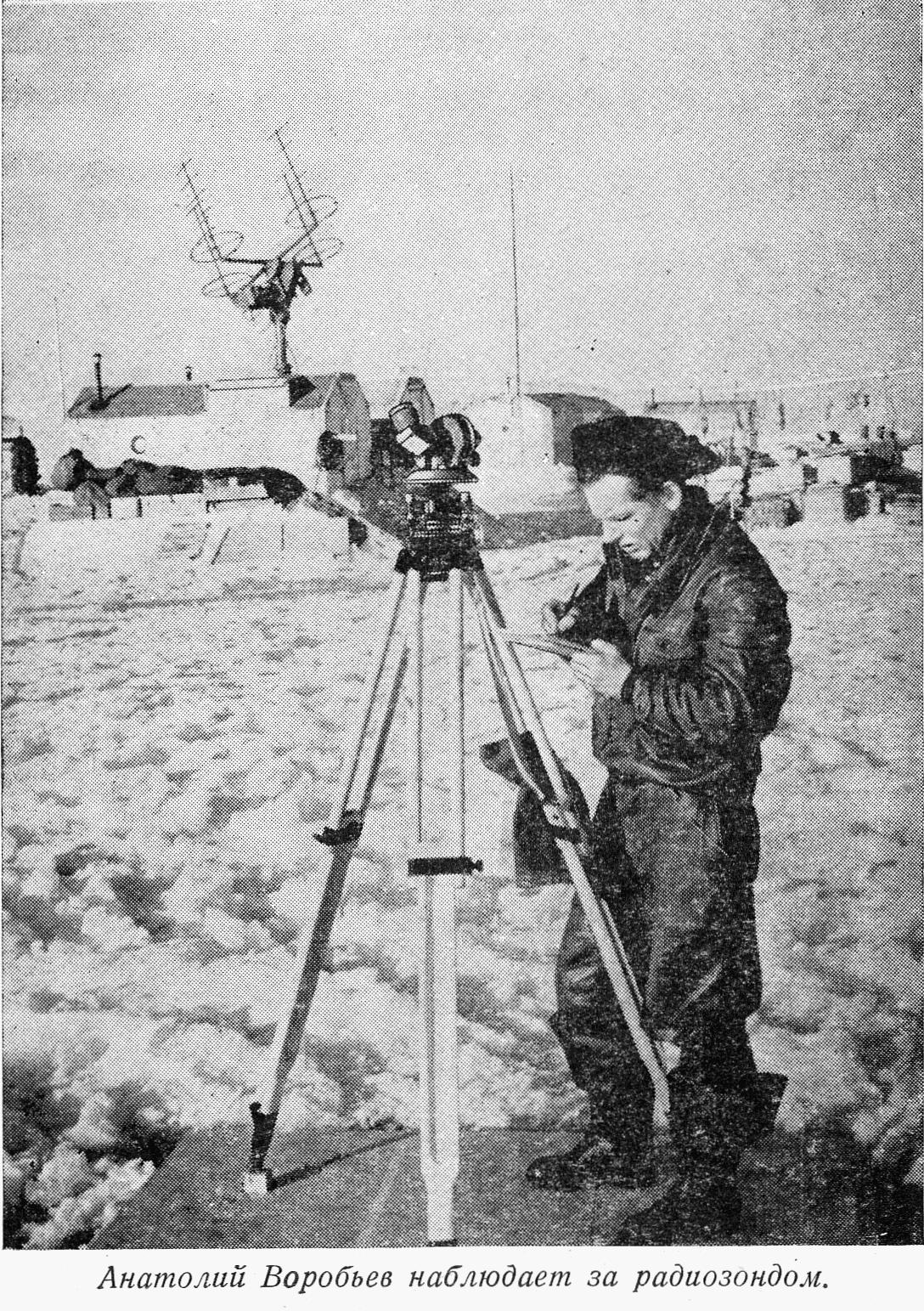 В состав группы входит и Анатолий Николаевич Воробьев — аэролог. Воспитанник Ленинградского арктического училища, он 13 лет проработал в Арктике, зимовал на Диксоне и в Дудинке. Недавно на общем собрании коллектива станции в Тикси Воробьева выбрали культоргом станции, и товарищи в шутку зовут его «министром культуры». Он большой книголюб и будет заведовать библиотекой и почтой. Анатолий невысокого роста, худощавый молодой человек. Ему 32 года.