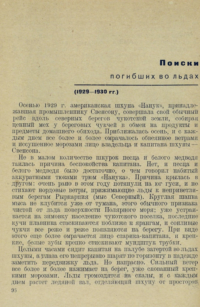 Осенью 1929 г. американская шхуна «Нанук», принадлежавшая промышленнику Свенсону, совершала свой обычный рейс вдоль северных берегов чукотской земли, собирая ценный мех у береговых чукчей в обмен на продукты и предметы домашнего обихода. Приближалась осень, и с каждым днем все более и более омрачалось обвеянное ветрами и иссушенное морозами лицо владельца и капитана шхуны — Свенсона.