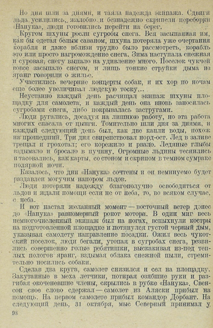 В октябре льды сильно сжимало. Трещал ветхий «Нанук, и испуганно бились сердца людей, находящихся па. нем и без устали смотрящих на восток в ожидании, когда покажется темная точка самолета на фоне угрюмых облаков.