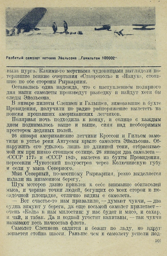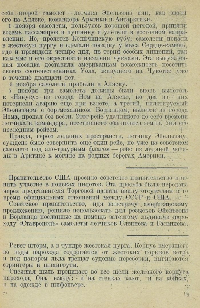 Правда, герою ледяных пространств, летчику Эйельсону, суждено было совершить еще один, рейс, но уже на советском самолете под ало-траурным флагом — рейс из ледяной могилы в Арктике к могиле на родных берегах Америки.