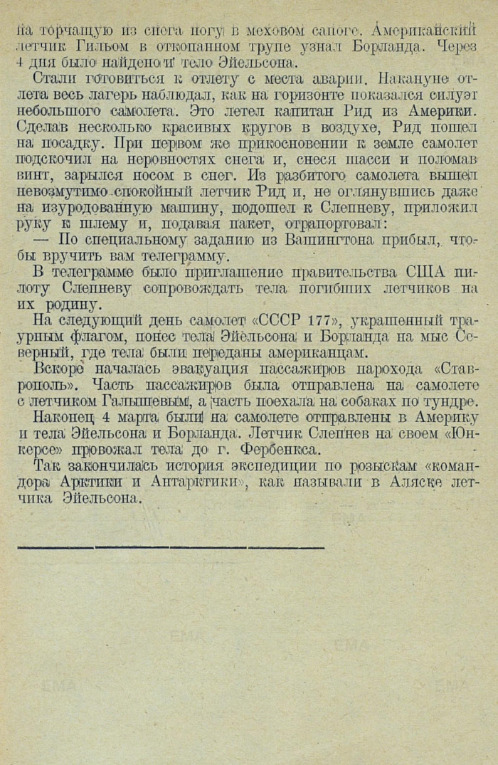 Наконец 4 марта были на самолете отправлены в Америку и тела Эйельсона и Борланда. Летчик Слепнев на своем «Юнкерсе» провожал тела до г. Фербенкса.