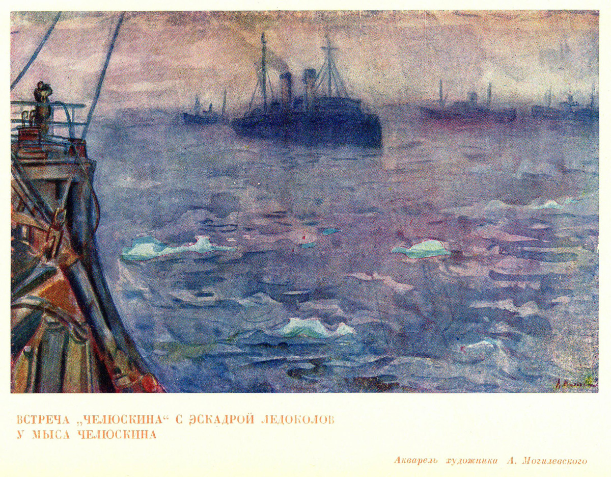 Тринадцатое августа. 20 часов. Идем полным ходом. Встречаются льдинки, как будто забытые кем-то. Волна от "Челюскина" набегает на них, нежно покачивает и бежит дальше.
