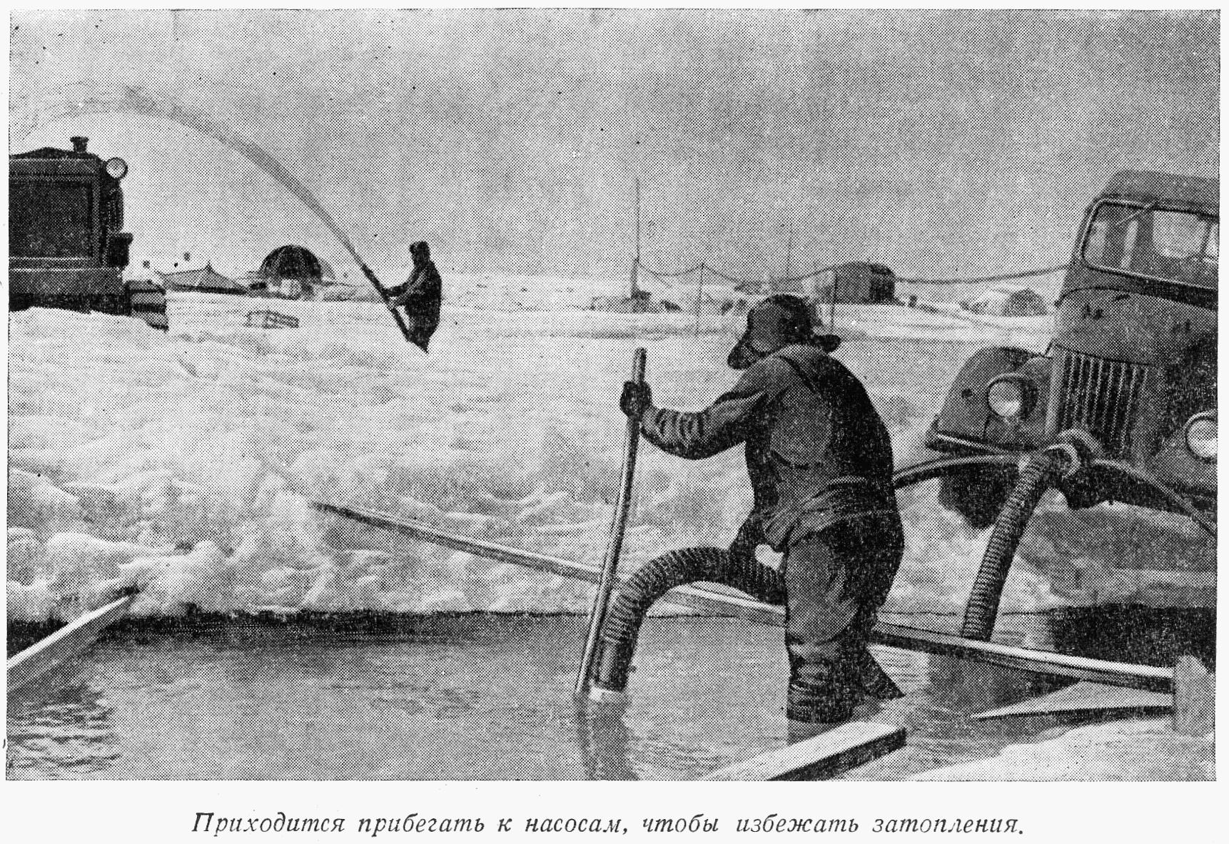 шумом рассыпались на отдельные куски гряды торосов. Возникали новые трещины, и тут же края льдин смыкались, нагромождая груды льда. Через час пришел в движение лед с восточной стороны льдины. Знакомые очертания торосов исчезли, на месте ровных участков появились новые нагромождения льда. В 13 часов 30 минут прилетела первая смена с базы. Витушкин рассказал, что сжатие захватило район «подскока». Разводья и трещины между нашей льдиной и полем базы сжало, везде свежие валы торошения. Полеты второй и третьей смен отменили. АН-2 оставили на полосе готовым к взлету. К вечеру сжатие ослабело. Льдина выдержала, если не считать трещины шириной 50 см вдоль южной кромки льда да заторошенных незначительных участков на востоке в районе склада пустых бочек и мусорной свалки.