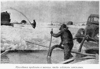Спущен трап. Начальник станции Николай Корнилов и гидролог Михаил Извеков с ящичками толщиномера спускаются на лед. Они не торопясь, обстоятельно обследуют льдину — выбирают место для станции. Ее решено строить в центре поля на склонах большого ледяного холма. Толщина льда здесь 12 м.