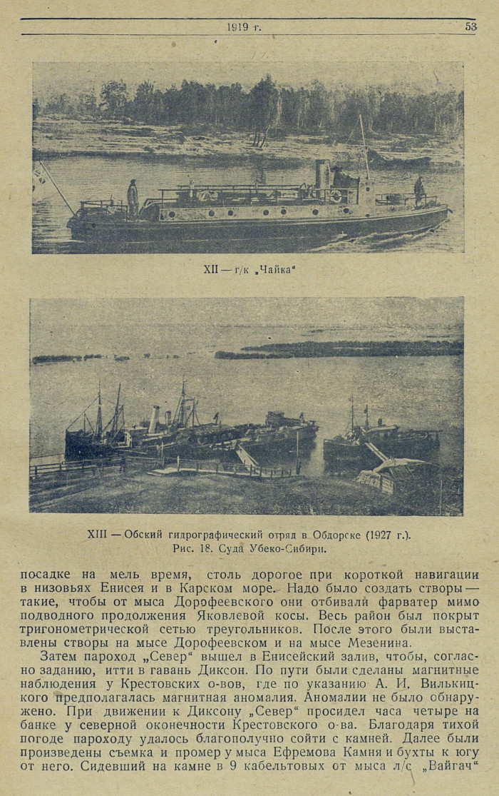 Гидрографические работы, выполненные в 1919 г. в Обской губе, в Енисейском заливе и в р. Енисее, основной своей задачей имели рекогносцировочное обследование для установления корабельного фарватера и обеспечения навигационным ограждением прохода морских судов, следующих в места разгрузочных операций, к бухте Находке в Обской губе и в Усть-Енисейский порт на р. Енисее.