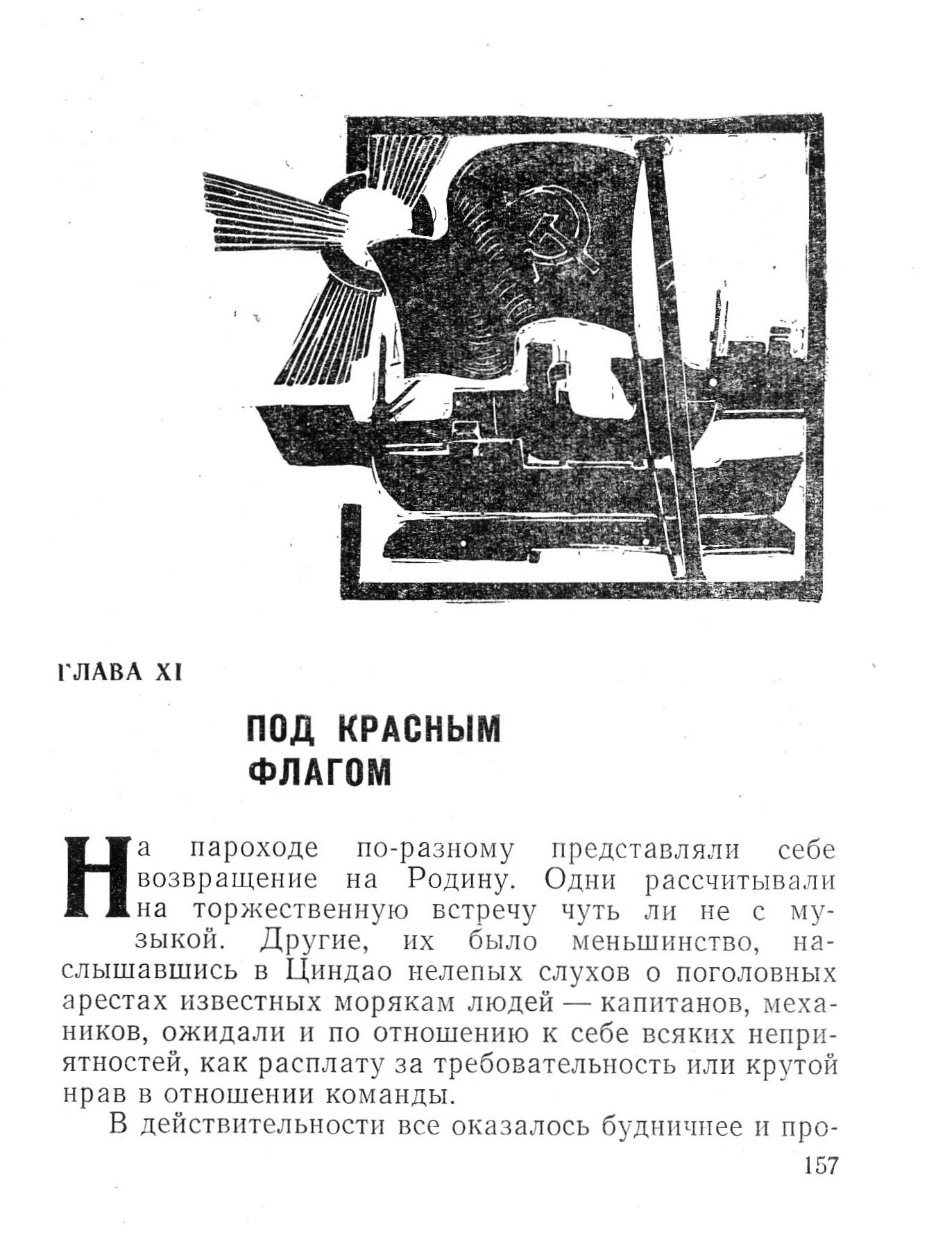 ГЛАВА XIПОД КРАСНЫМ ФЛАГОМНа пароходе по-разному представляли себе возвращение на Родину. Одни рассчитывали на торжественную встречу чуть ли не с музыкой. Другие, их было меньшинство, наслышавшись в Циндао нелепых слухов о поголовных арестах известных морякам людей — капитанов, механиков, ожидали и по отношению к себе всяких неприятностей, как расплату за требовательность или крутой нрав в отношении команды.
