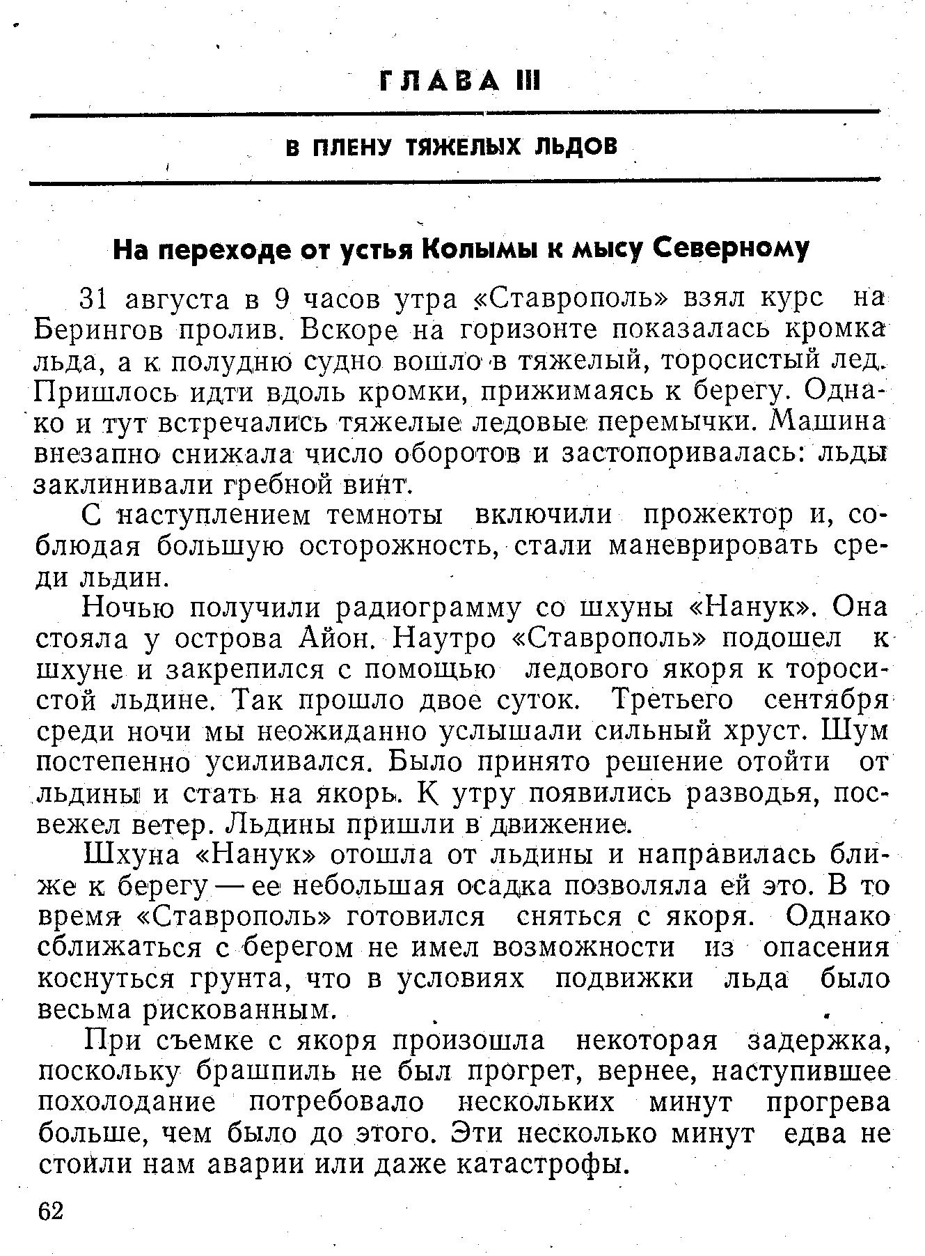Ночью получили радиограмму со шхуны «Нанук». Она стояла у острова Айон. Наутро «Ставрополь» подошел к шхуне и закрепился с помощью ледового якоря к торосистой льдине. Так прошло двое суток. Третьего сентября среди ночи мы неожиданно услышали сильный хруст. Шум постепенно усиливался. Было принято решение отойти от льдины и стать на якорь. К утру появились разводья, посвежел ветер. Льдины пришли в движение.