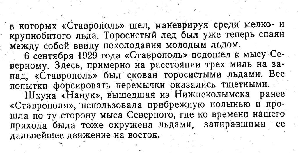 6 сентября 1929 года «Ставрополь» подошел к мысу Северному. Здесь, примерно на расстоянии трех миль на запад, «Ставрополь» был скован торосистыми льдами. Все попытки форсировать перемычки оказались тщетными.