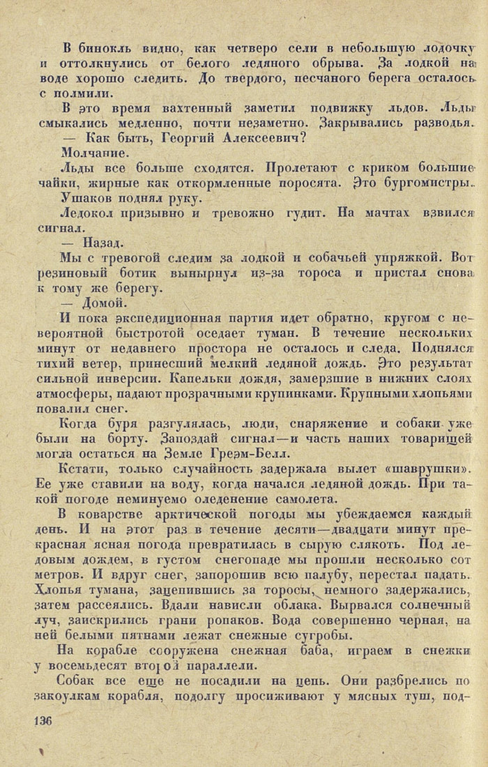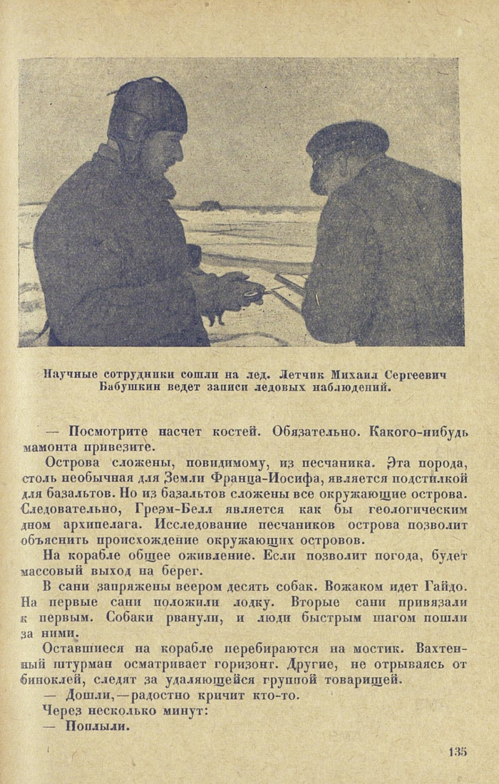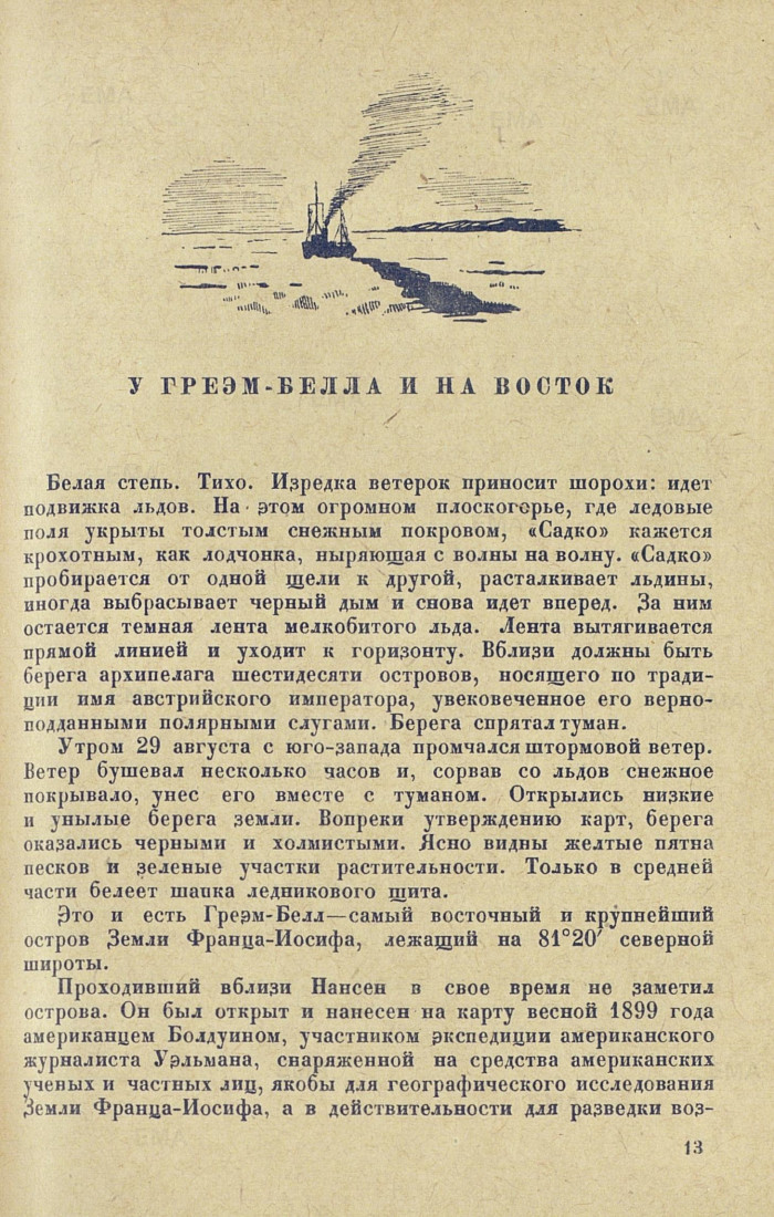 У ГРЕЭМ-БЕЛЛА И НА ВОСТОКБелая степь. Тихо. Изредка ветерок приносит шорохи: идет подвижка льдов. На этом огромном плоскогорье, где ледовые поля укрыты толстым снежным покровом, «Садко» кажется крохотным, как лодчонка, ныряющая с волны на волну. «Садко» пробирается от одной щели к другой, расталкивает льдины, иногда выбрасывает черный дым и снова идет вперед. За ним остается темная лента мелкобитого льда. Лента вытягивается прямой линией и уходит к горизонту. Вблизи должны быть берега архипелага шестидесяти островов, носящего по традиции имя австрийского императора, увековеченное его верноподданными полярными слугами. Берега спрятал туман.