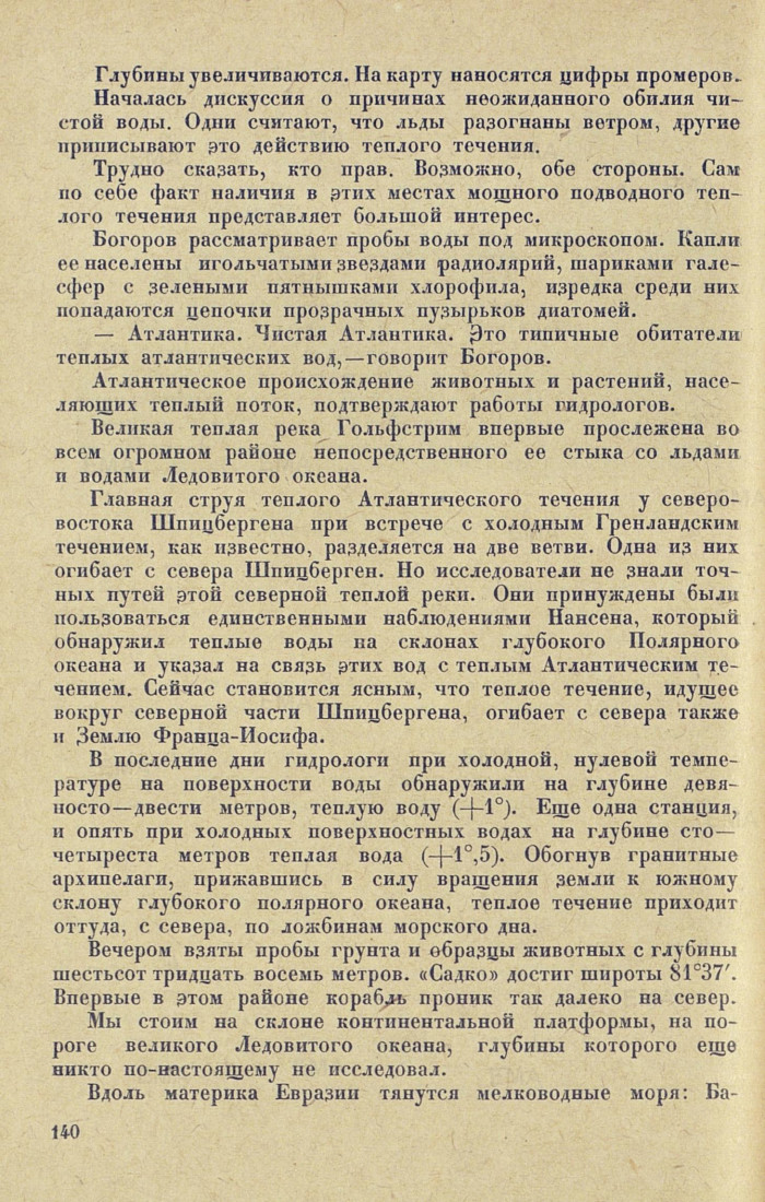 Главпая струя теплого Атлантического течения у северо-востока Шпицбергена при встрече с холодным Гренландским течением, как известно, разделяется на две ветви. Одна из них огибает с севера Шпицберген. Но исследователи не знали точных путей этой северной теплой реки. Они принуждены были пользоваться единственными наблюдениями Нансена, который обнаружил теплые воды на склонах глубокого Полярного океана и указал на связь этих вод с теплым Атлантическим течением. Сейчас становится ясным, что теплое течение, идущее вокруг северной части Шпицбергена, огибает с севера также и Землю Франца-Иосифа.