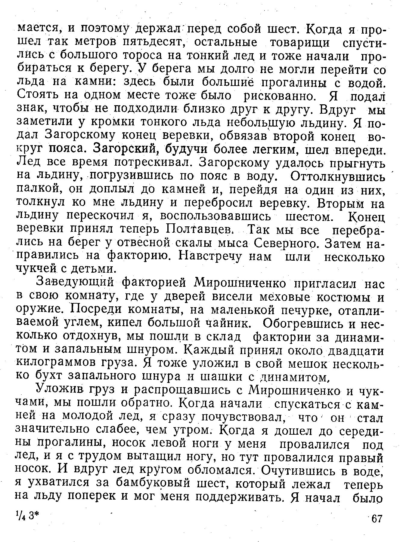 мается, и поэтому держал перед собой шест. Когда я прошел так метров пятьдесят, остальные товарищи спустились с большого тороса на тонкий лед и тоже начали пробираться к берегу. У берега мы долго не могли перейти со льда на камни: здесь были большие прогалины с водой. Стоять на одном месте тоже было рискованно. Я подал знак, чтобы не подходили близко друг к другу. Вдруг мы заметили у кромки тонкого льда небольшую льдину. Я подал Загорскому конец веревки, обвязав второй конец вокруг пояса. Загорский, будучи более легким, шел впереди. Лед все время потрескивал. Загорскому удалось прыгнуть на льдину, погрузившись по пояс в воду. Оттолкнувшись палкой, он доплыл до камней и, перейдя на один из них, толкнул ко мне льдину и перебросил веревку. Вторым на льдину перескочил я, воспользовавшись шестом. Конец веревки принял теперь Полтавцев. Так мы все перебрались на берег у отвесной скалы мыса Северного. Затем направились на факторию. Навстречу нам шли несколько чукчей с детьми.