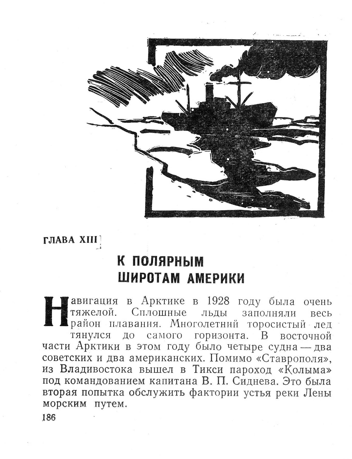 ГЛАВА ХIIIК ПОЛЯРНЫМ ШИРОТАМ АМЕРИКИНавигация в Арктике в 1928 году была очень тяжелой. Сплошные льды заполняли весь район плавания. Многолетний торосистый лед тянулся до самого горизонта. В восточной части Арктики в этом году было четыре судна — два советских и два американских. Помимо «Ставрополя», из Владивостока вышел в Тикси пароход «Колыма» под командованием капитана В. П. Сиднева. Это была вторая попытка обслужить фактории устья реки Лены морским путем.