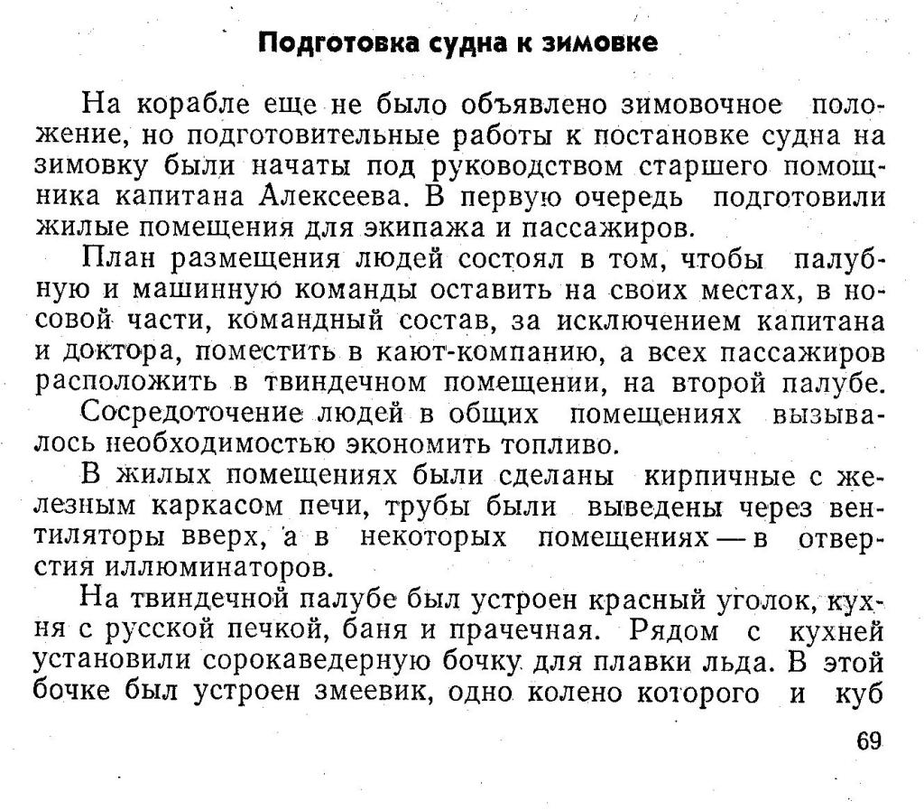 На корабле еще не было объявлено зимовочное положение, но подготовительные работы к постановке судна на зимовку были начаты под руководством старшего помощника капитана Алексеева. В первую очередь подготовили жилые помещения для экипажа и пассажиров.