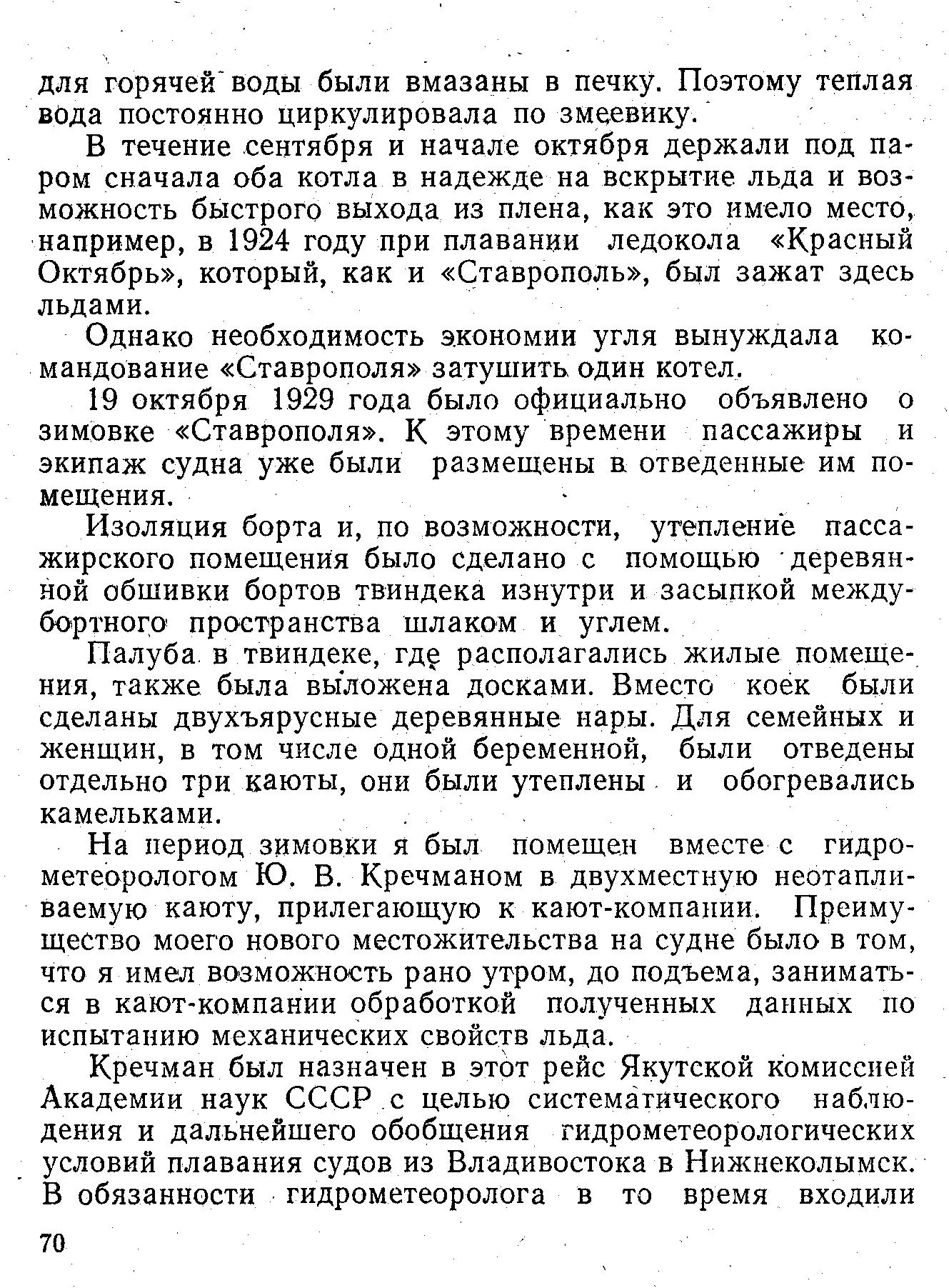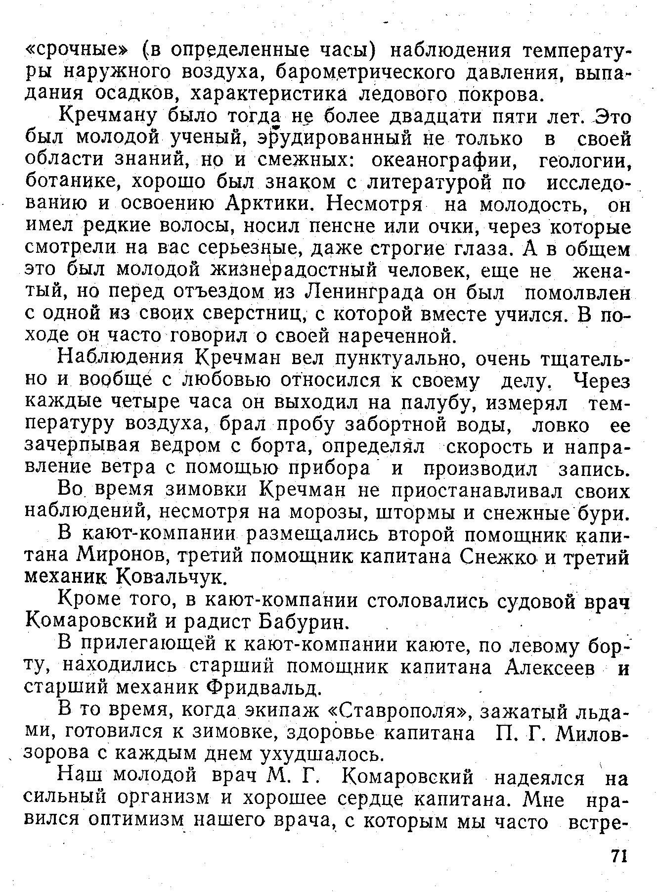 Кречману было тогда не более двадцати пяти лет. Это был молодой ученый, эрудированный не только в своей области знаний, но и смежных: океанографии, геологии, ботанике, хорошо был знаком с литературой по исследованию и освоению Арктики. Несмотря на молодость, он имел редкие волосы, носил пенсне или очки, через которые смотрели на вас серьезные, даже строгие глаза. А в общем это был молодой жизнерадостный человек, еще не женатый, но перед отъездом из Ленинграда он был помолвлен с одной из своих сверстниц, с которой вместе учился. В походе он часто говорил о своей нареченной.