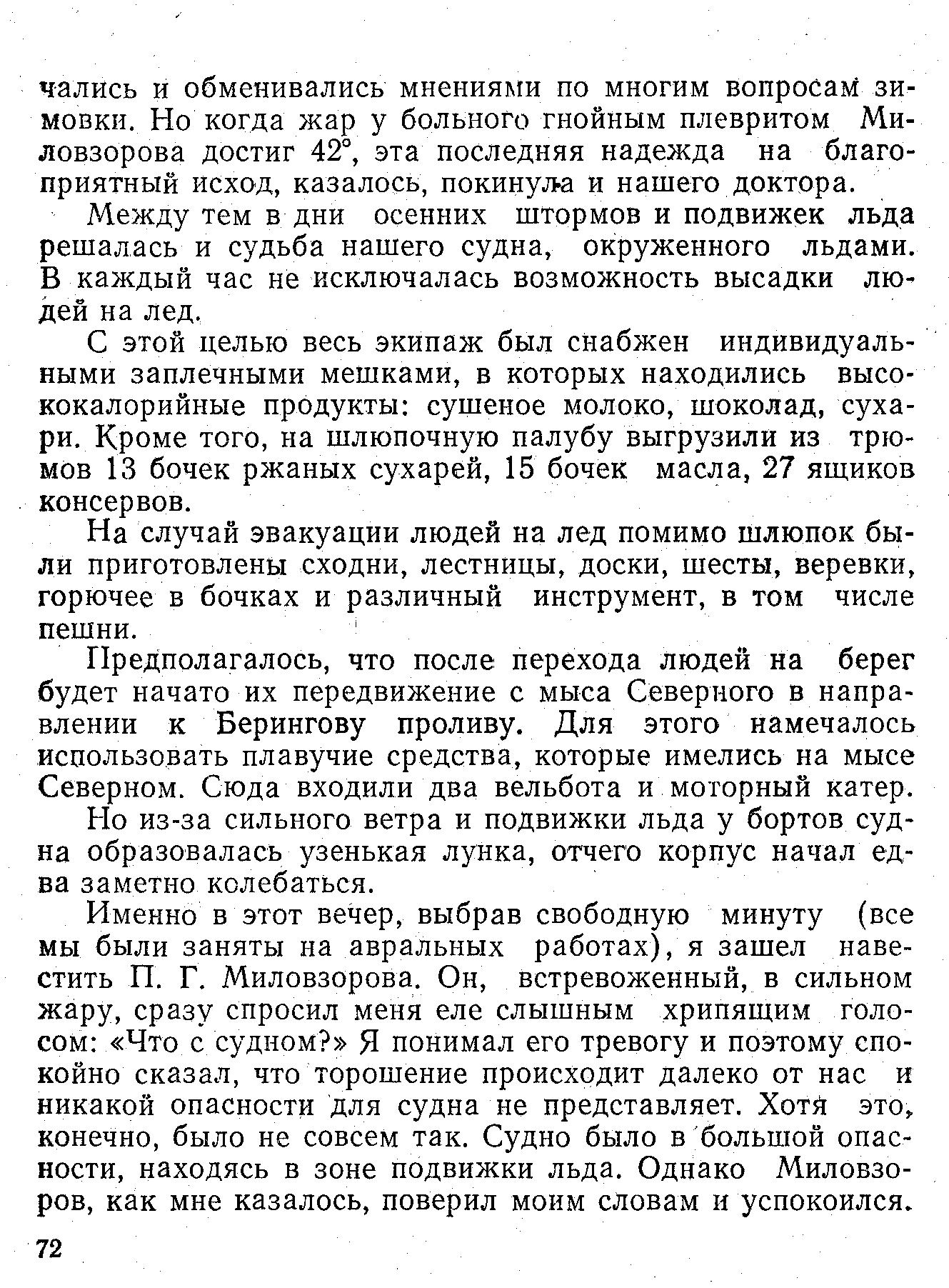 Именно в этот вечер, выбрав свободную минуту (все мы были заняты на авральных работах), я зашел навестить П. Г. Миловзорова. Он, встревоженный, в сильном жару, сразу спросил меня еле слышным хрипящим голосом: «Что с судном?» Я понимал его тревогу и поэтому спокойно сказал, что торошение происходит далеко от нас и никакой опасности для судна не представляет. Хотя это,, конечно, было не совсем так. Судно было в большой опасности, находясь в зоне подвижки льда. Однако Миловзоров, как мне казалось, поверил моим словам и успокоился.