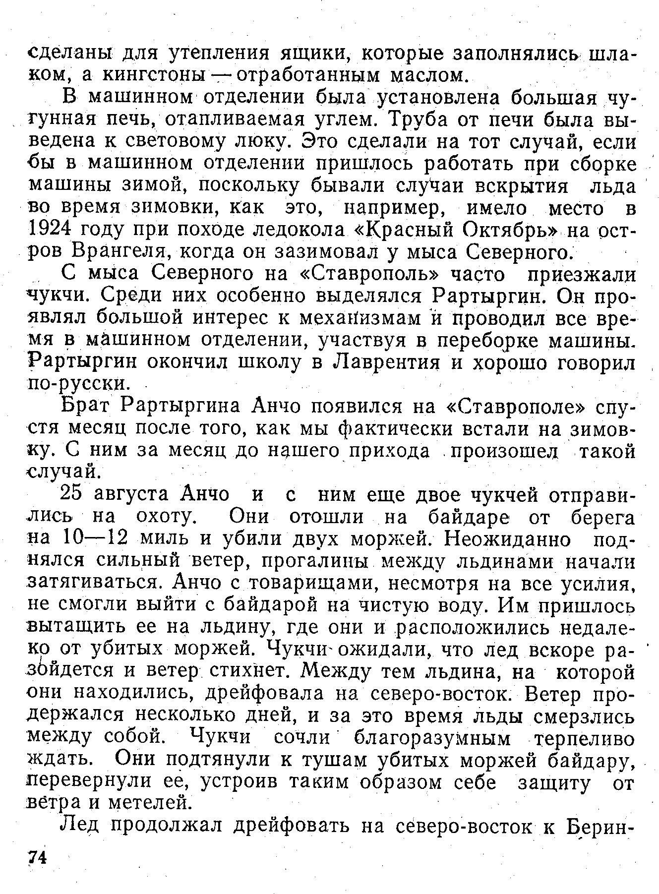 С мыса Северного на «Ставрополь» часто приезжали чукчи. Среди них особенно выделялся Рартыргин. Он проявлял большой интерес к механизмам и проводил все время в машинном отделении, участвуя в переборке машины. Рартыргин окончил школу в Лаврентия и хорошо говорил по-русски.