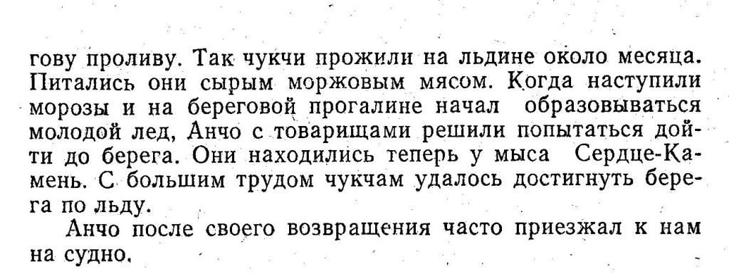 гову проливу. Так чукчи прожили на льдине около месяца. Питались они сырым моржовым мясом. Когда наступили морозы и на береговой прогалине начал образовываться молодой лед, Анчо с товарищами решили попытаться дойти до берега. Они находились теперь у мыса Сердце-Камень. С большим трудом чукчам удалось достигнуть берега по льду.